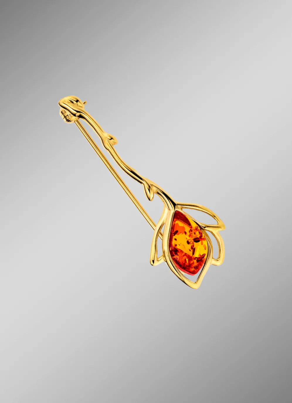 Im Zentrum des Designs steht ein echter Bernstein, der für seine warme, erdige Farbe und seinen faszinierenden Glanz bekannt ist. Die Anstecknadel mit den Maßen 41×15 mm betont die Schönheit des Steins und verleiht ihr eine beeindruckende Präsenz.