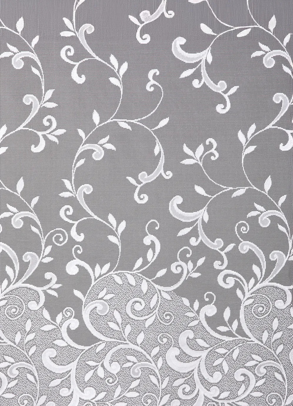Himmlischer Blumenfenster-Store mit gebogtem Abschluss der besonders ausdrucksstark designiert ist. Jacquard aus 100% Polyester. Mit Universalschienenband. Maße: HxB