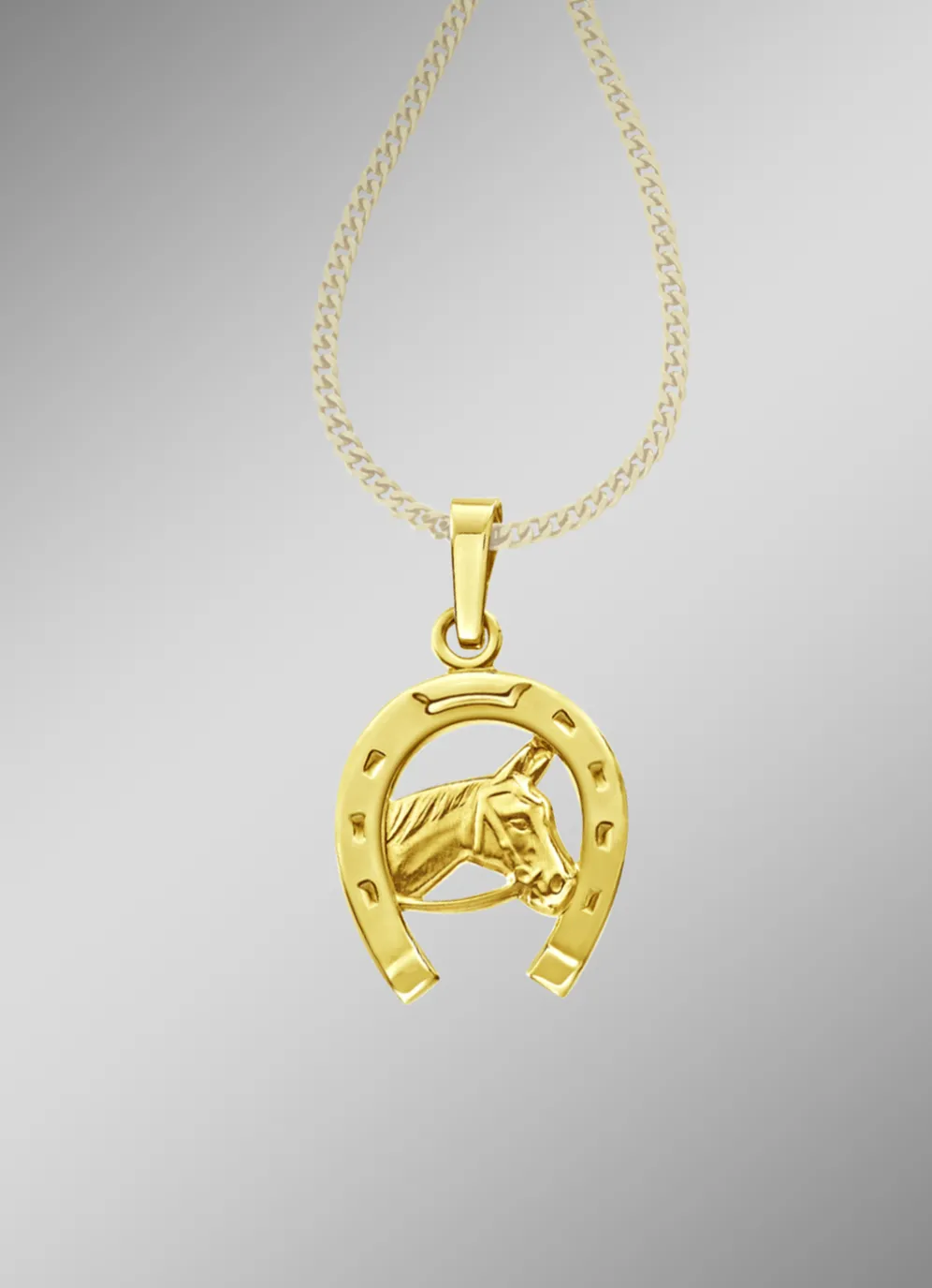 Der Anhänger ist sowohl aus Gold 585/- fein als auch aus Gold 375/- fein gefertigt. Ein beliebter Halsschmuck mit den Maßen 12×14 mm. Das schicke Accessoire „Hufeisen mit Pferd“ wird Sie auf Schritt und Tritt begleiten und für den einen oder anderen Glücksmoment sorgen.