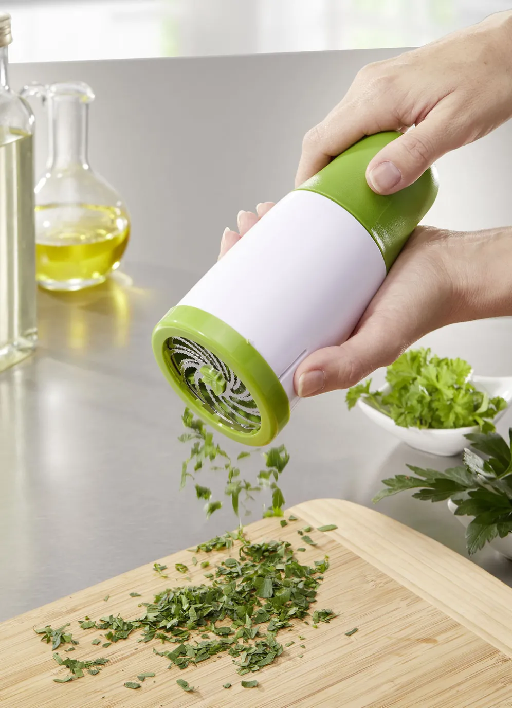 Gehackte Kräuter im Handumdrehen – zerkleinern Sie mit dieser schicken, kleinen Kräutermühle im Nu frische Kräuter wie Petersilie, Dill, Rosmarin, Basilikum, Thymian uvm. Einfach Kräuter einfüllen, drehen – fertig! Verfeinern Sie Ihre Speisen schnell und einfach. Die hochwertigen Edelstahlklingen zerkleinern alle Kräuter in Windeseile. Die Kräutermühle in frischem grünem Design ist klein, kompakt, passt in jede Schublade und ist einfach zu reinigen. Kunststoffteile sind spülmaschinengeeignet. Maße: B7,5xH17xT7,5 cm.