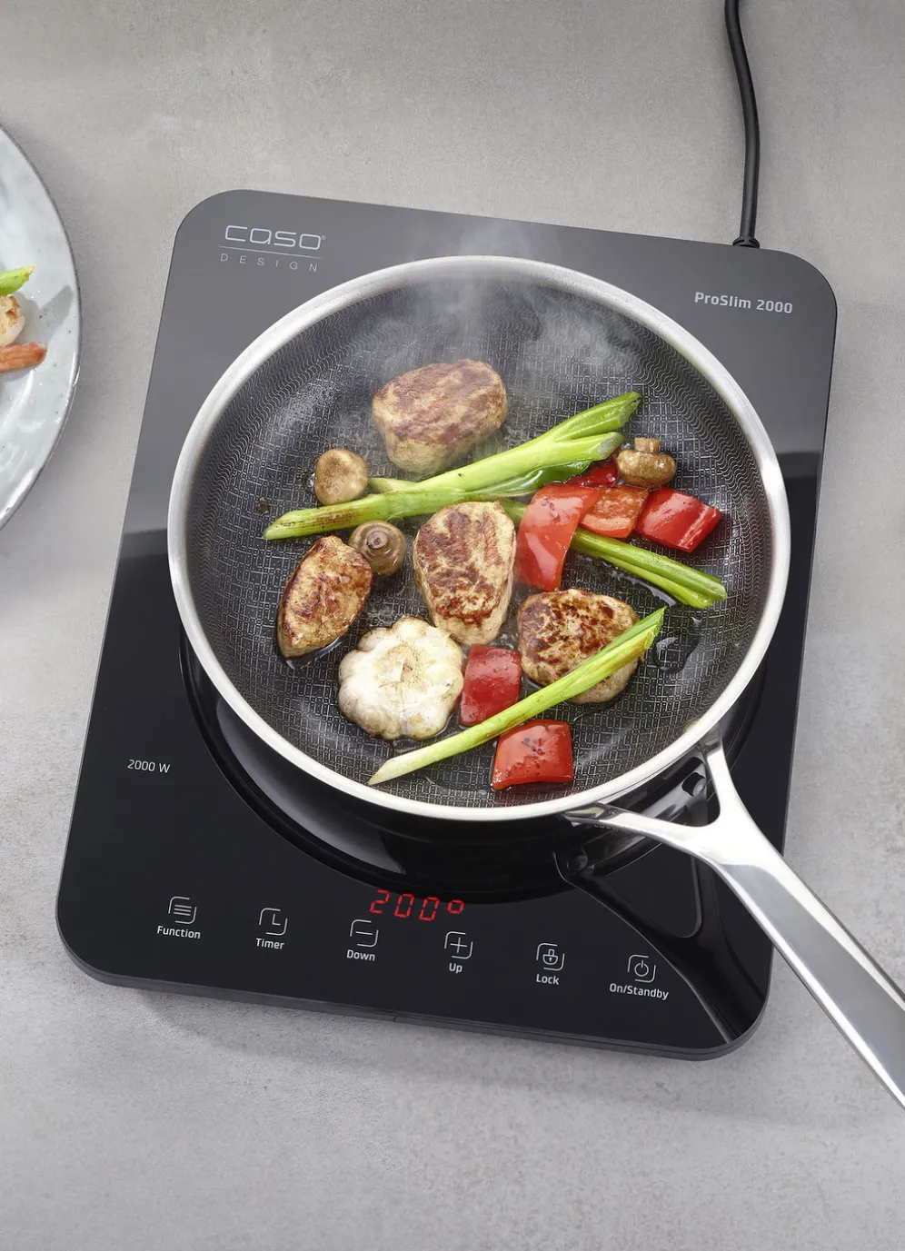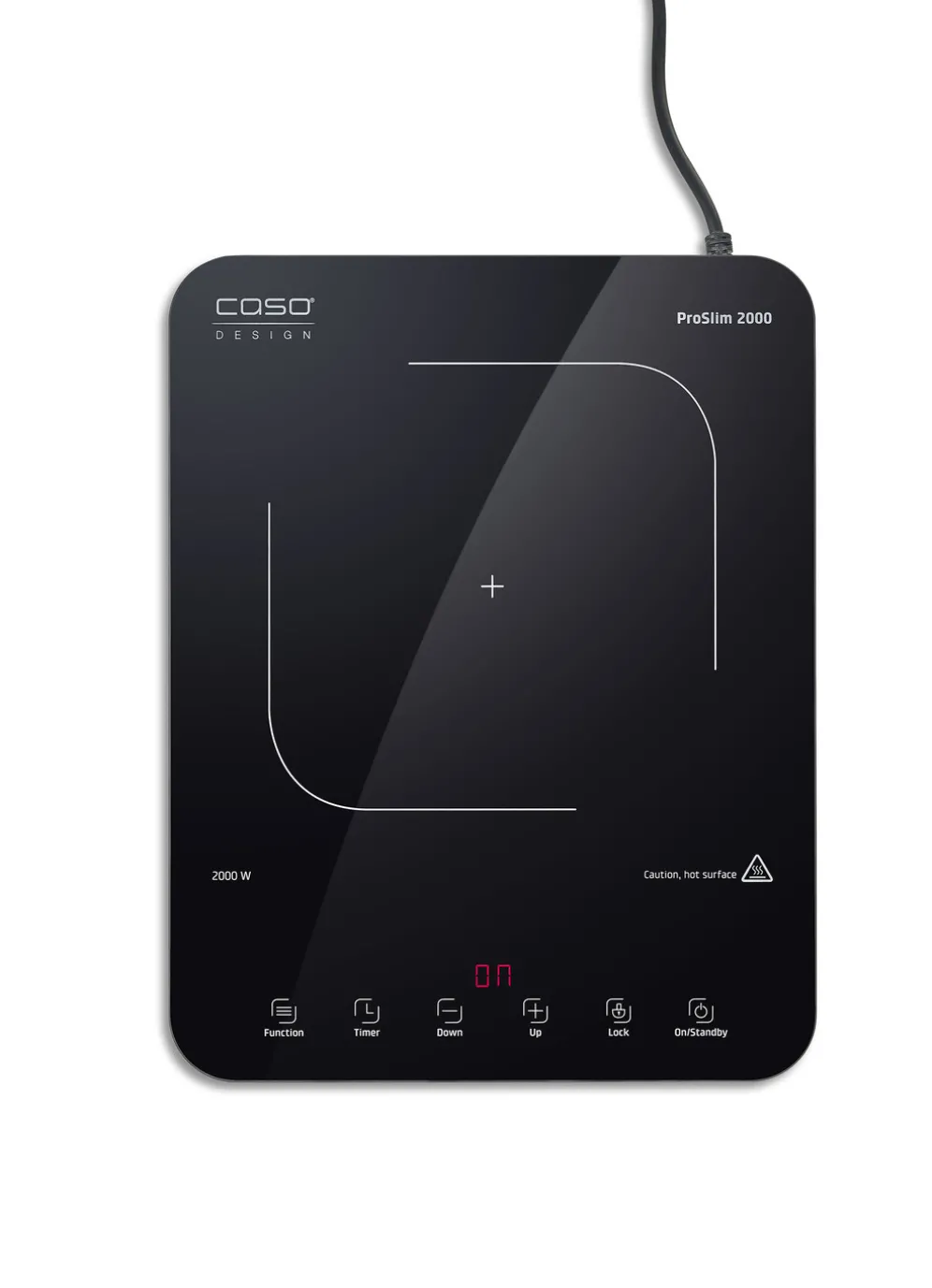 „CASO“ Induktionskochplatte „ProSlim 2000“ zum sicheren und energiesparenden Kochen. Super schlankes und platzsparendes Desgign mit hochwertiger Ganzglasoberfläche. Vielseitiger und flexibler Einsatz, ideal für Outdoorküchen, Ferienhäuser oder als zusatzplatte zum Warmhalten von Speisen am Tisch. 10 Temperaturstufen von 60 bis 240 °C und 10 Leistungsstufen von 200 bis 2000 Watt. Automatische Erkennung von induktionsgeei0 Temperaturstufen von 60 bis 240 °Cgneten bzw. –ungeeigneten Töpfen von ø 12 cm bis 22 cm. Automatische Abschaltung nach 2 Stunden. Timer bis 240 Minuten einstellbar. Intuitives Sensor-Touch-Display mit LED Digitalanzeige. Kindersicherung und Überhitzungsschutz. Wiegt nur 2,3kg. Maße: B29xH2,8xT39 cm