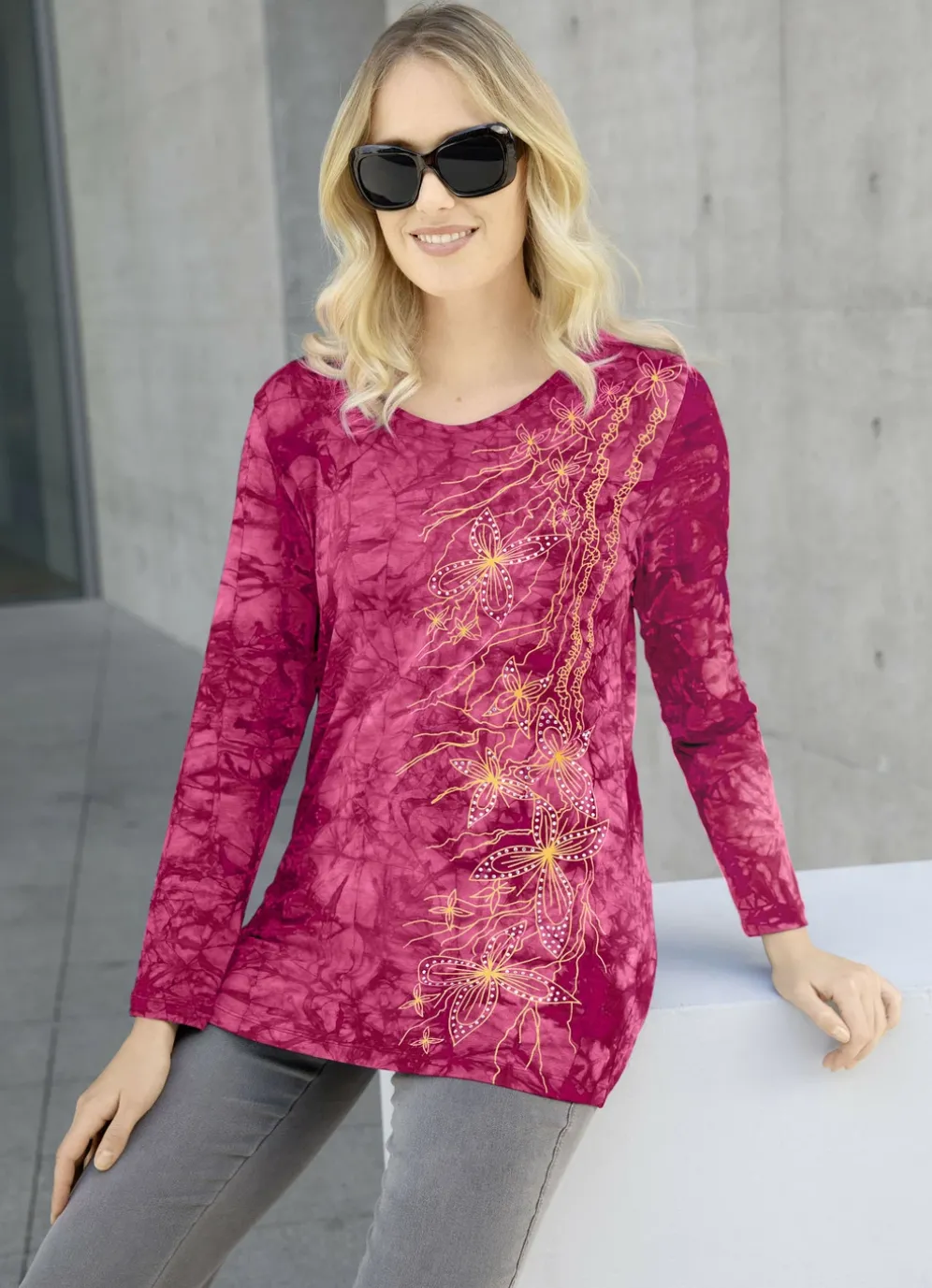 Jedes Teil ein Unikat! Die interessante Batikoptik macht dieses Shirt mit Kontrast-Druck und Strasszier im Vorderteil zu etwas ganz Besonderem.
