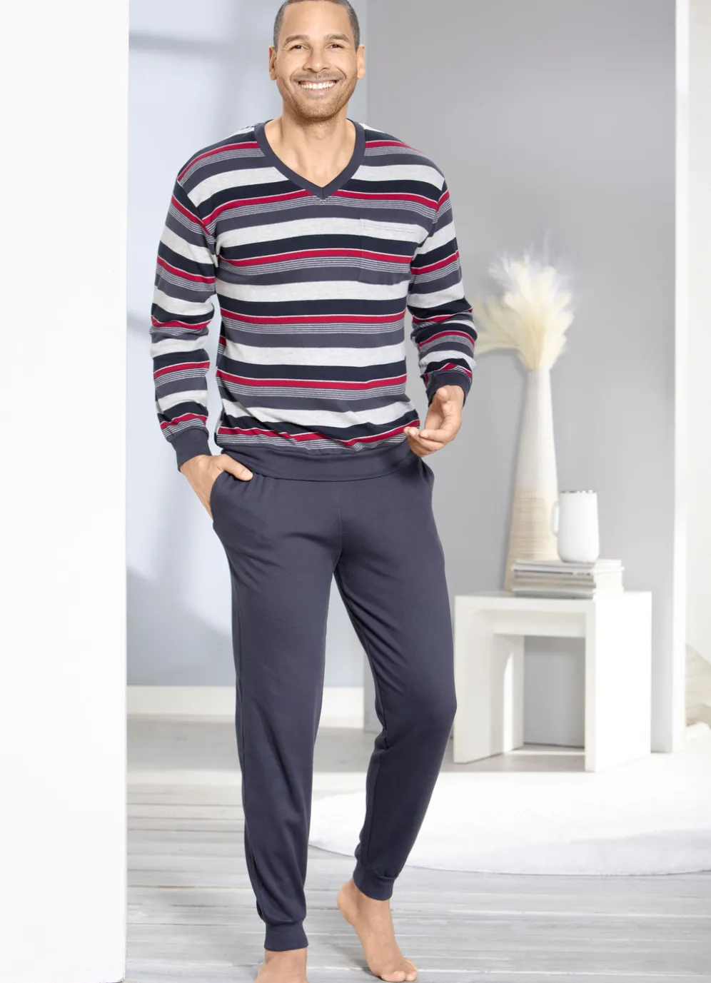 Hochwertiger Schlafanzug im attraktiven Zweierpack! Oberteile mit V-Ausschnitt, garngefärbtem Ringel, aufgesetzter Brusttasche, innerem Rückensattel und Bündchenabschlüssen. Lange, grafitfarbene Hosen mit Dehnbund, Seitentaschen und Bündchenabschlüssen.