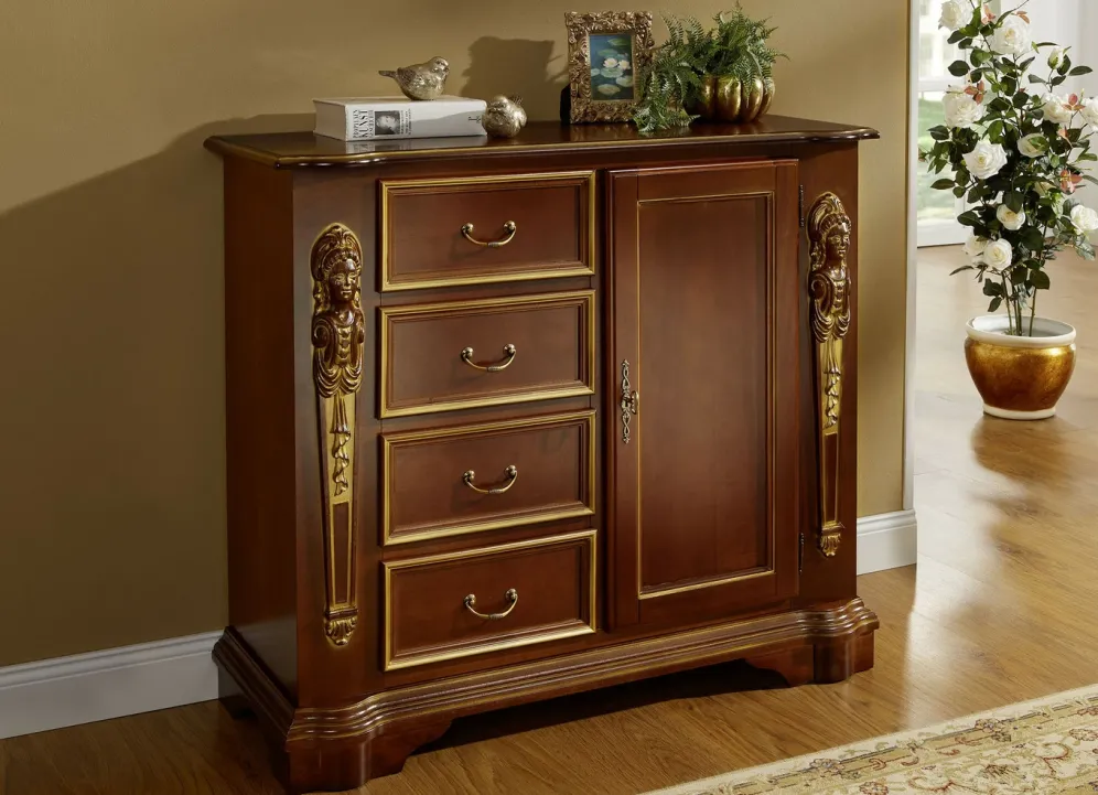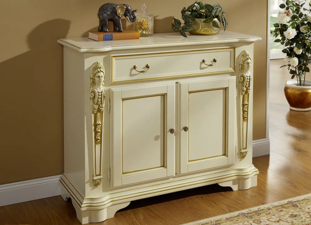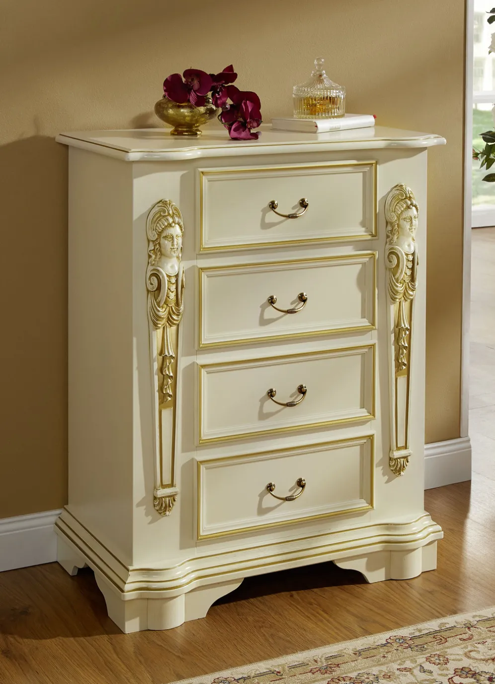Ein wahres Highlight in Ihrem Zuhause wird diese italienische Kommodenserie! Mit reich verzierten Fronten, Schubladen und Türen, eingearbeiteten Frauenskulpturen seitlich sowie edlen Metallgriffen an den Schubladen und Knöpfen an den Türen. Die Lieferung erfolgt aufgebaut.