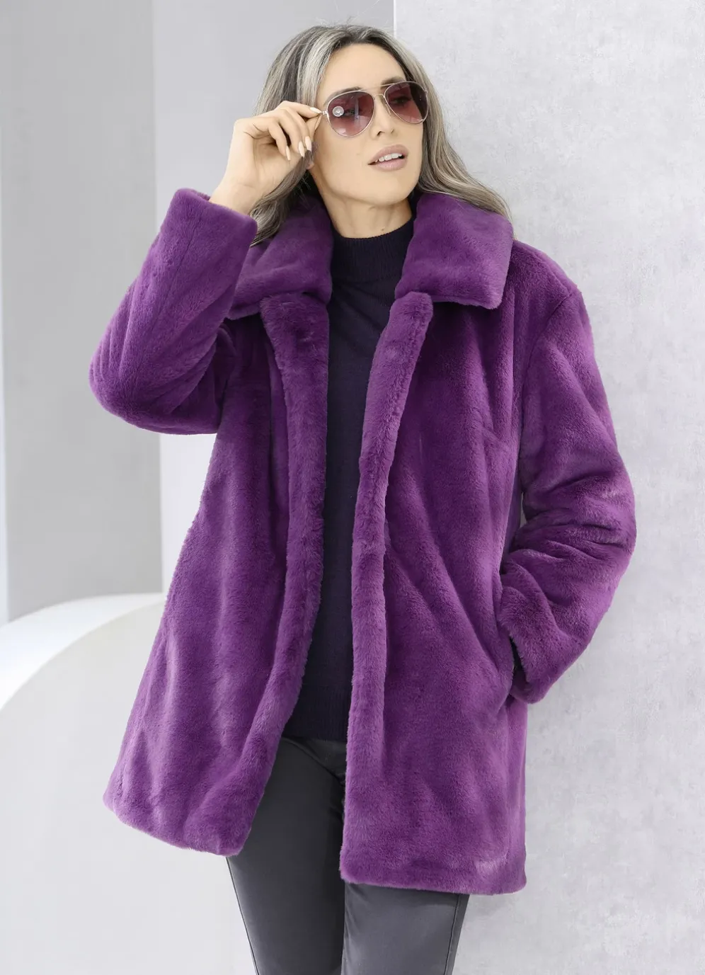 Flauschige Jacke in Amethyst mit Kragen, Hakenverschlüssen sowie Nahttaschen. Länge ca. 80 cm, ab Gr. 46 ca. 82 cm.
