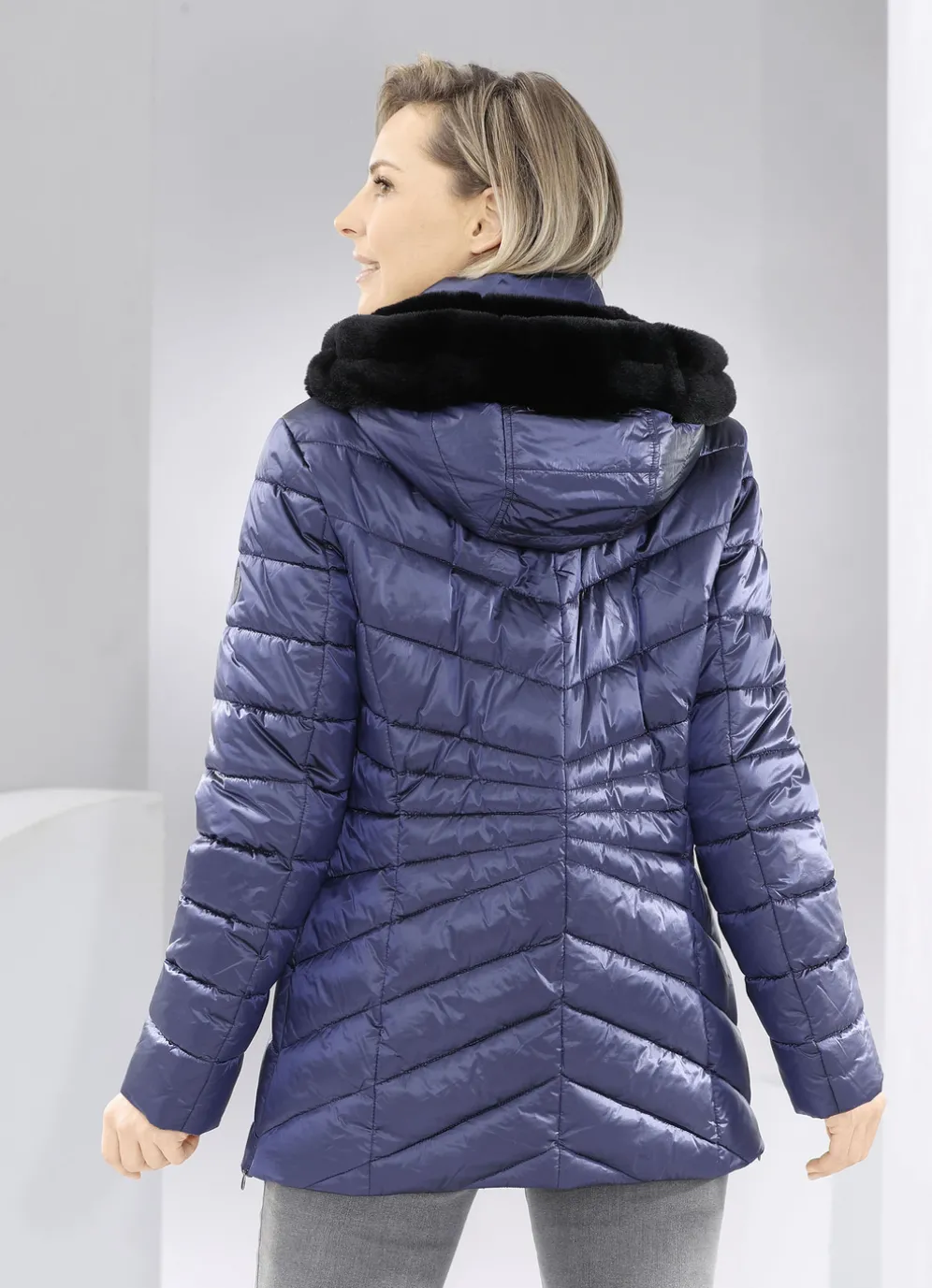 Jacke mit Durchzugsband, Stopper und Kunstpelz-Innenausstattung in der abnehmbaren Kapuze, durch Reißverschluss hoch schließbarem Stehkragen, Reißverschluss an den Taschen und Seitenschlitzen sowie einer Innentasche. Länge ca. 72 cm, ab Gr. 44 ca. 74 cm, ab Gr. 46 ca. 76 cm.