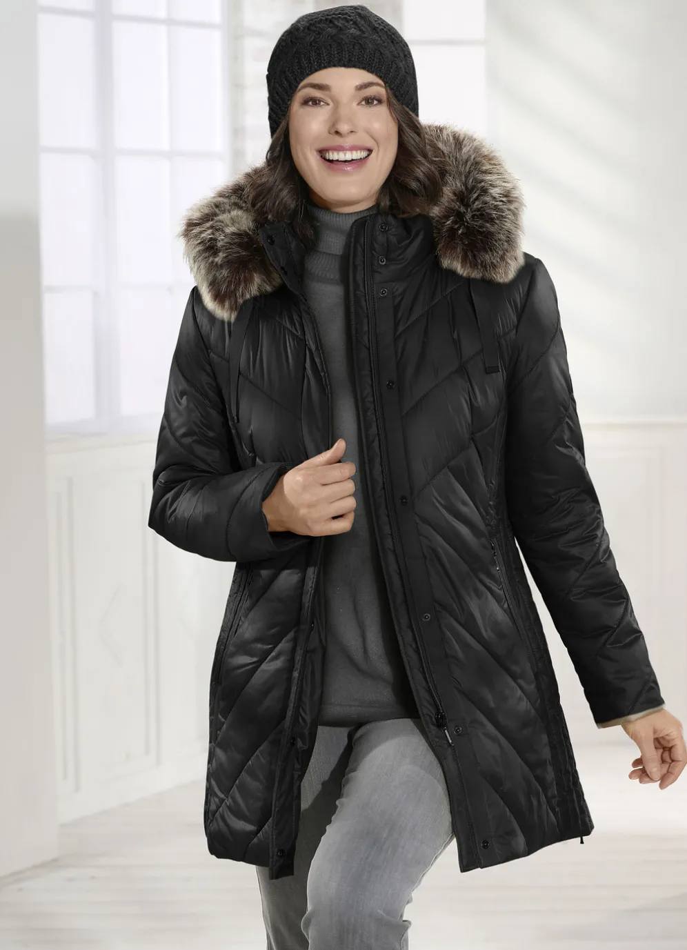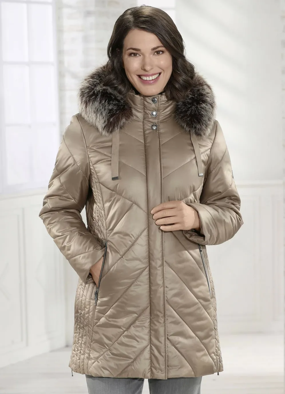 Exquisite Jacke mit figurgünstiger Längssteppung seitlich, Durchzugsband, Stopper und abnehmbarem Kunstpelz-Besatz an der abnehmbaren Kapuze, durch Reißverschluss unter der verdeckten Druckerleiste hoch schließbarem Stehkragen mit Druckern, Reißverschluss an den Taschen und Seitenschlitzen, umschlagbaren Ärmeln sowie einer Innentasche. Länge ca. 82 cm.