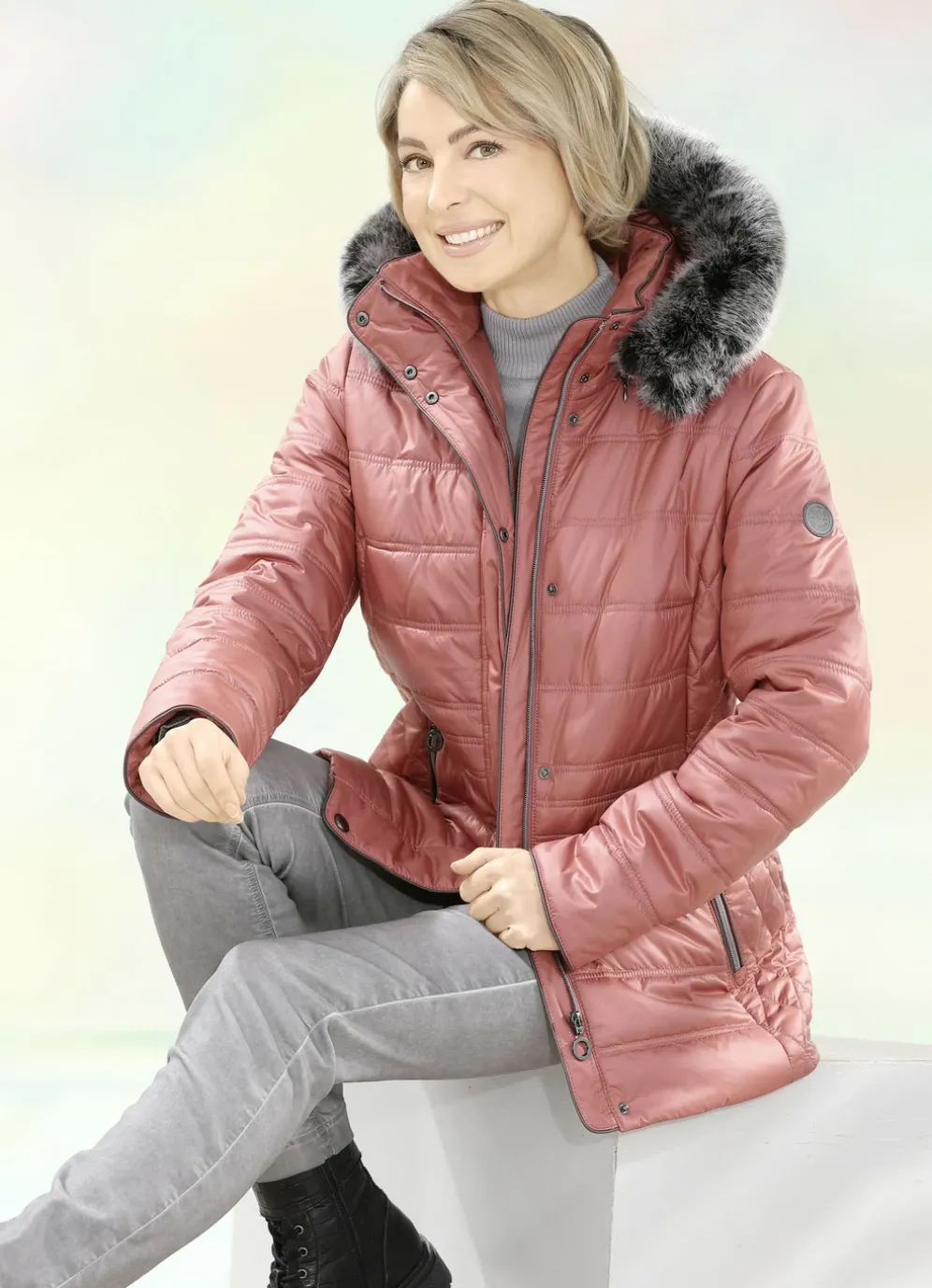 Ein absoluter Trendsetter ist diese Jacke mit kontrastfarbenen Nappaleder-Imitatpaspeln an den Kanten: Durchzugsband, Stopper und abnehmbarer Kunstpelz-Besatz an der abnehmbaren Kapuze, durch Reißverschluss unter der Druckerleiste hoch schließbarer Stehkragen, Reißverschlusstaschen, umschlagbare Ärmel sowie eine Innentasche. Länge ca. 70 cm, ab Gr. 42 ca. 72 cm, ab Gr. 46 ca. 74 cm.
