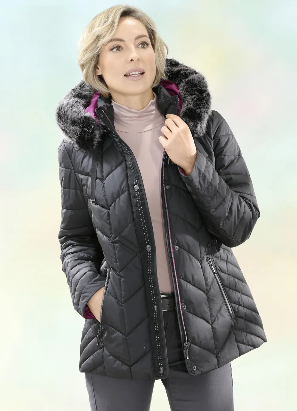Tolle Jacke mit Durchzugsband, Stopper und abnehmbarem Kunstpelz-Besatz an der abnehmbaren Kapuze, durch Reißverschluss unter der Druckerleiste hoch schließbarem Stehkragen, Reißverschlusstaschen sowie einer Innentasche. Länge ca. 68 cm, ab Gr. 42 ca. 70 cm, ab Gr. 46 ca. 72 cm, ab Gr. 50 ca. 74 cm.