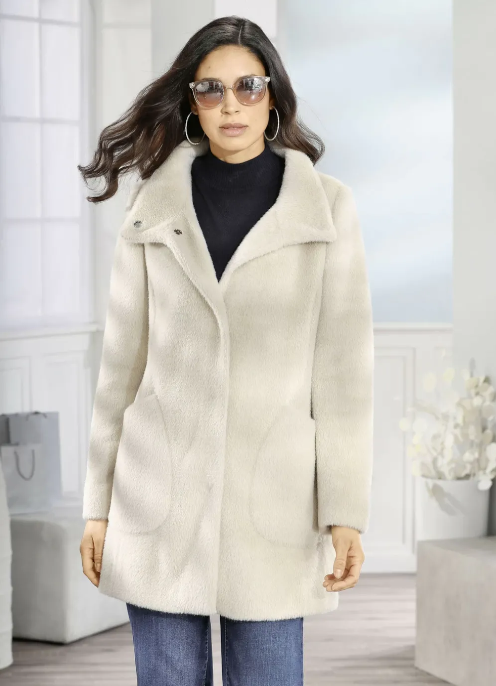Ein perfekter Begleiter ist diese Jacke in Beige, mit aparter Kragenlösung, elegant verdeckter Druckerleiste, aufgesetzten Taschen sowie einer Innentasche. Länge ca. 80 cm, ab Gr. 38 ca. 82 cm, ab Gr. 44 ca. 84 cm, ab Gr. 50 ca. 86 cm.