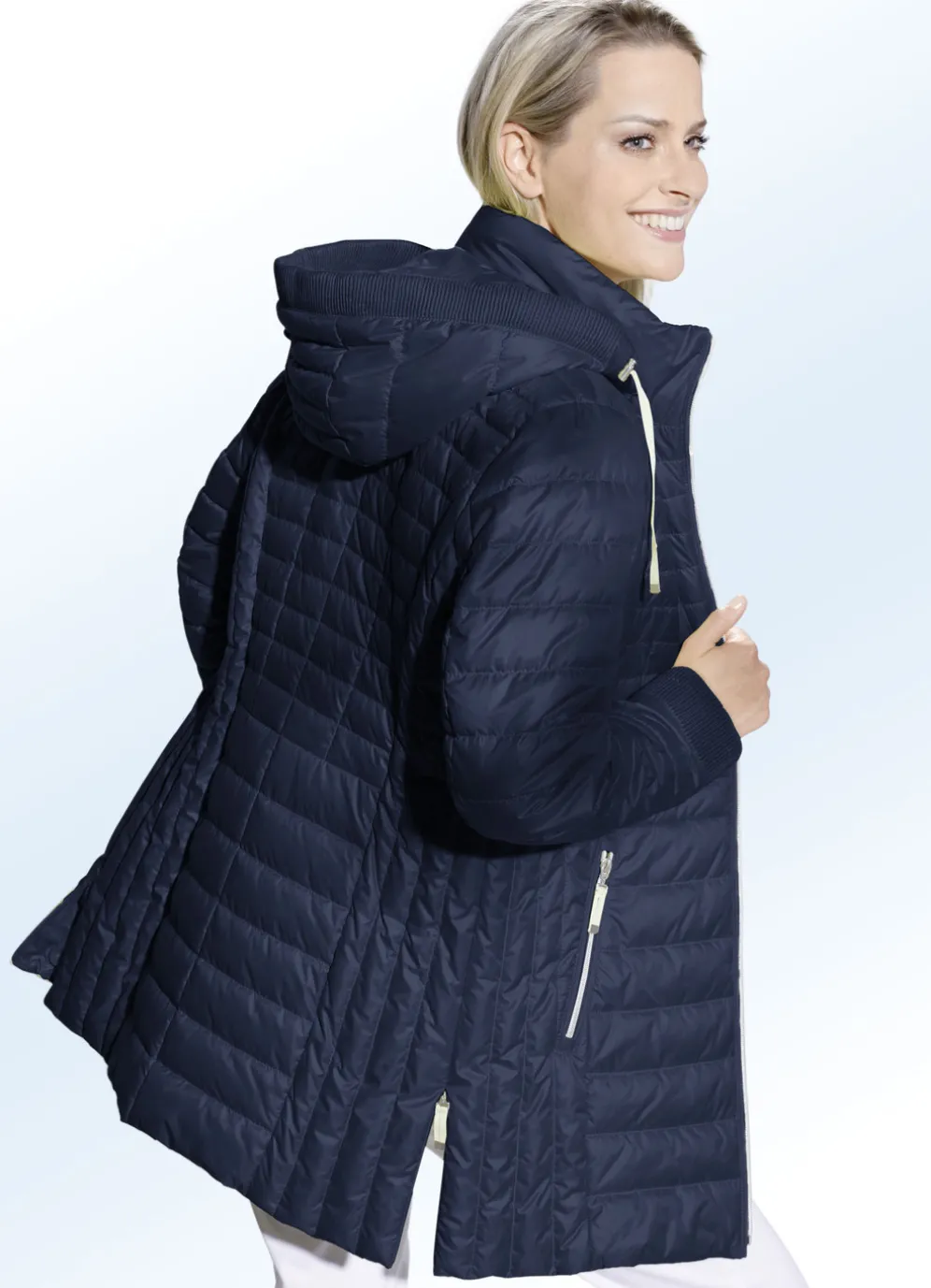 Sagenhafte Jacke mit Durchzugsband und Stopper in der abnehmbaren Kapuze mit gesmoktem Rand, durch Reißverschluss hoch schließbarem Stehkragen, Reißverschluss an Paspeltaschen und Seitenschlitzen, seitlich figurgünstiger Längssteppung, gesmokten Ärmelabschlüssen sowie einer Innentasche. Länge ca. 80 cm.