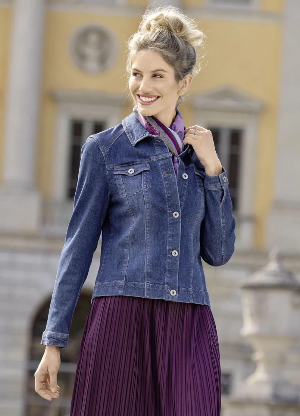 Jacke mit Knopfleiste in Jeansblau und in Größe 42.