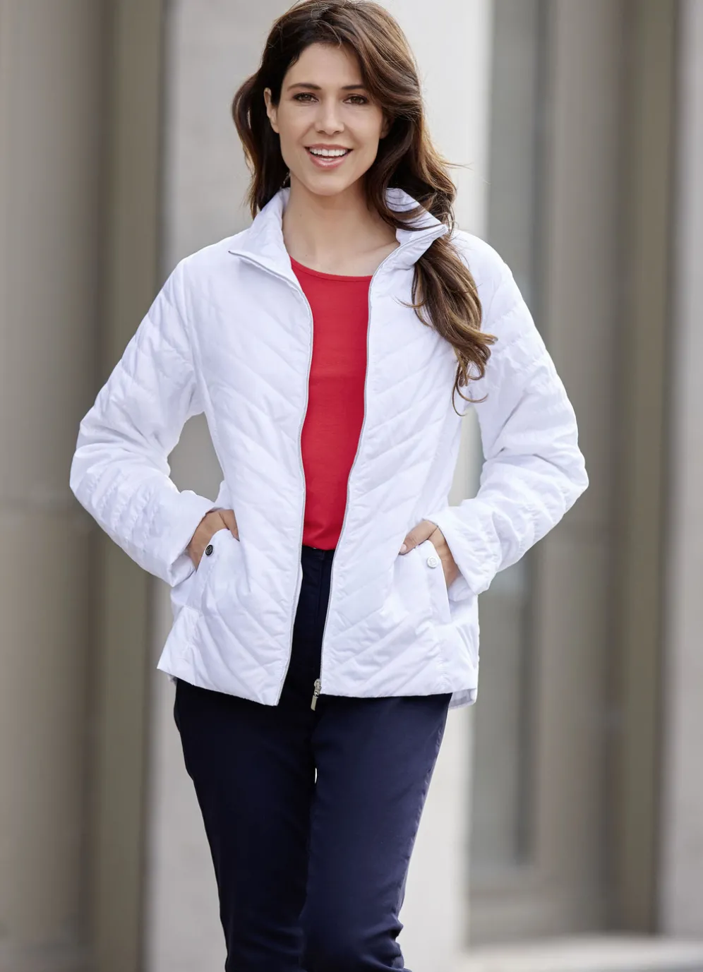 Jacke: durch Reißverschluss hoch schließbarer Stehkragen, Schubtaschen mit Blende und Drucker, umschlagbare Ärmel sowie eine Innentasche. Länge ca. 65 cm, ab Gr. 42 ca. 67 cm, ab Gr. 48 ca. 69 cm.