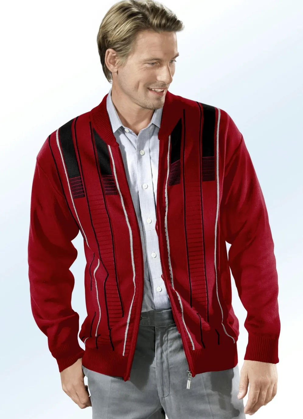 In bester Qualität und Verarbeitung zeigt sich diese faszinierende Jacke mit kontrastfarbenem Jacquard- und Struktur- Dessin im Vorderteil, durchgehendem Reißverschluss, Schubtaschen sowie Rippenstrick-Abschlüssen.