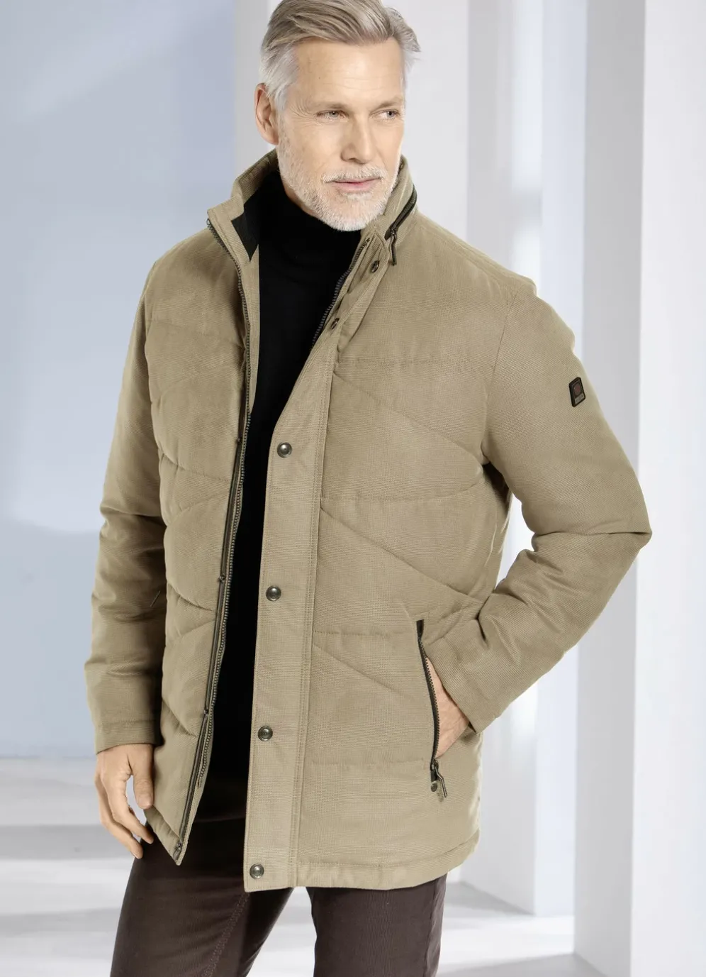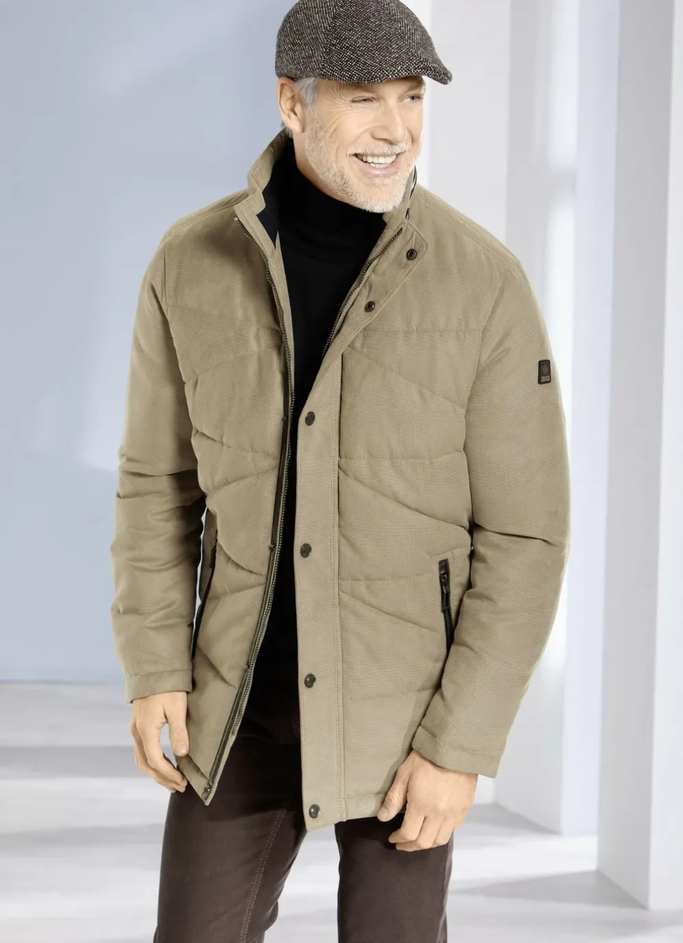 „Gate One“-Jacke in Sandbeige, mit Strickbesatz und Zier-Reißverschluss am Kragen, Reißverschluss unter der Druckerleiste, Emblem am linken Ärmel, zwei Reißverschluss-Taschen sowie zwei Innentaschen.