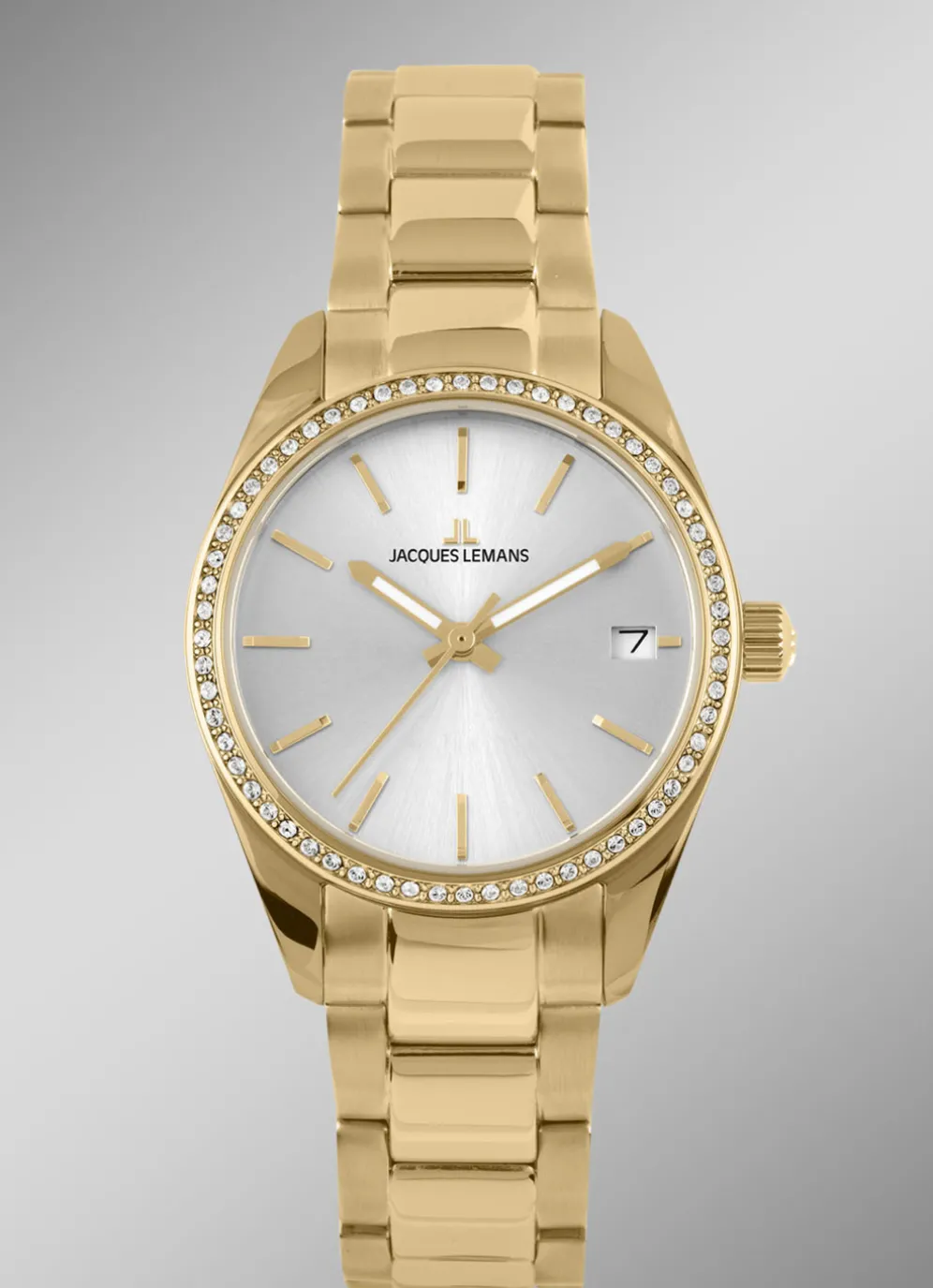 Eleganz trifft auf Sportlichkeit. Entdecken Sie die perfekte Verbindung aus Stil und Funktionalität mit dieser exquisiten Damenuhr von Jacques Lemans. Ihr edles goldfarbenes Edelstahlgehäuse (30 mm) sorgt für eine elegante Optik, während das hochwertige Crystexglas das Zifferblatt zuverlässig schützt. Strahlend weiße Kristalle setzen funkelnde Akzente und verleihen der Uhr eine glamouröse Note.