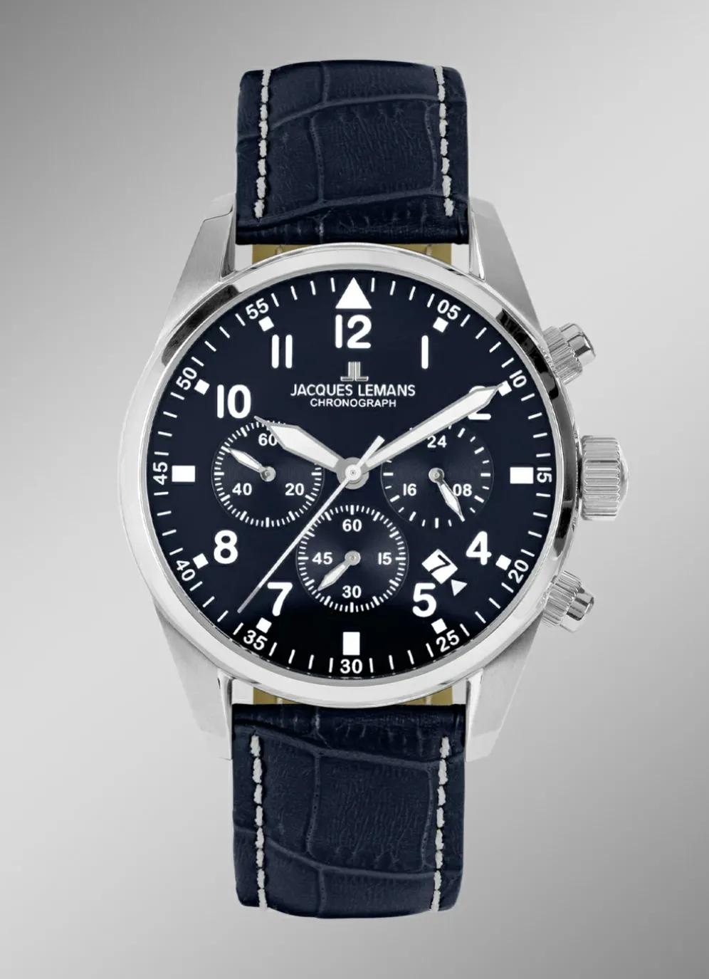 Mit Quarzwerk und klassischem Gehäuse mit 42mm Durchmesser aus massiv Edelstahl. Das gut strukturierte, dunkelblaue Zifferblatt mit Chronoringen besticht optisch durch eine Kombination aus arabischen Ziffern und Indexes, einer Datums- und 24-Stundenanzeige, Minuten- und Sekundenzähler und einer Stoppfunktion.
