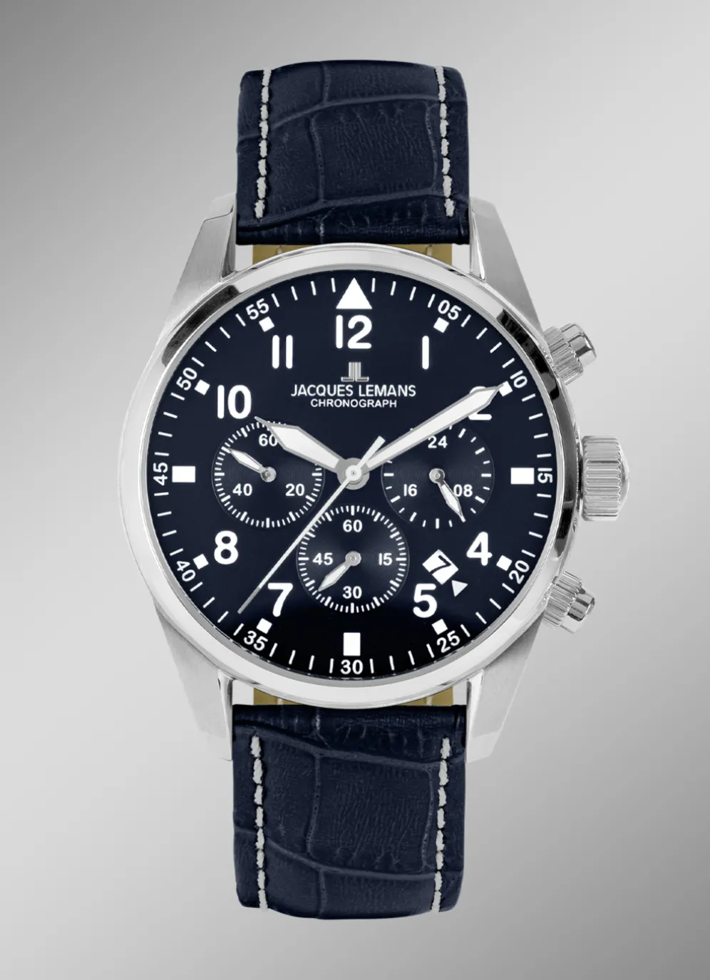 Zeitlose Eleganz gepaart mit schlichter Sportlichkeit – so präsentiert sich dieser Chronograph Jacques Lemans 42-2B
