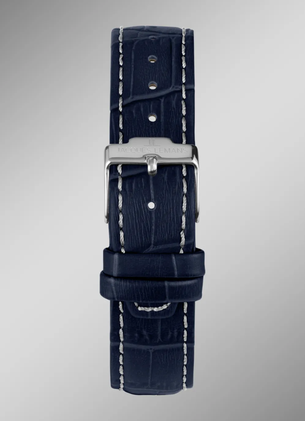 Das gehärtete Crystex-Glas ist robust, der Gehäuseboden rund und verschraubt. Das hochwertige, dunkelblaue Lederarmband mit Dornschließe und eine Wasserdichtigkeit bis zu 10 bar machen den sportlich, eleganten Alltags-Look perfekt.