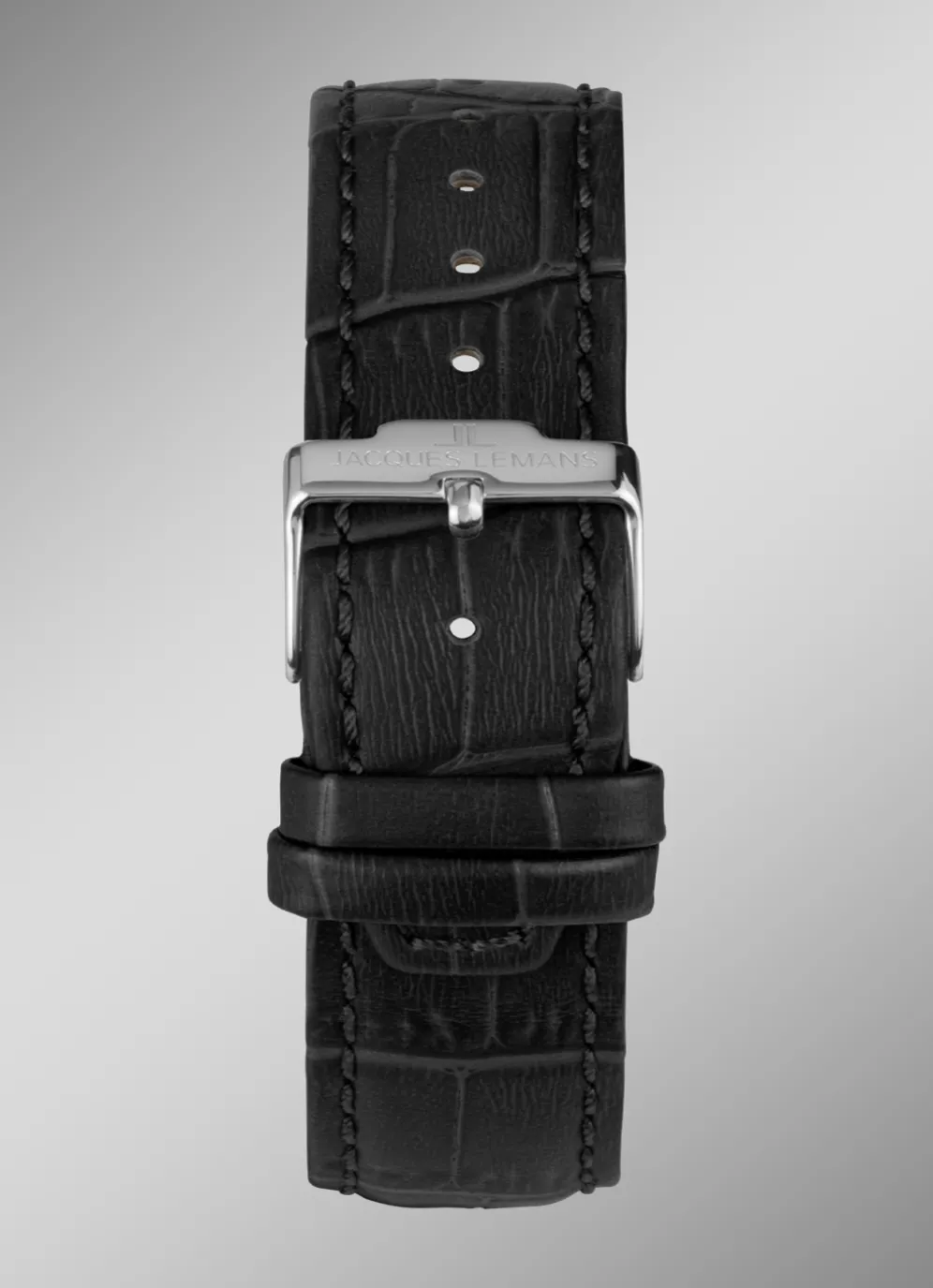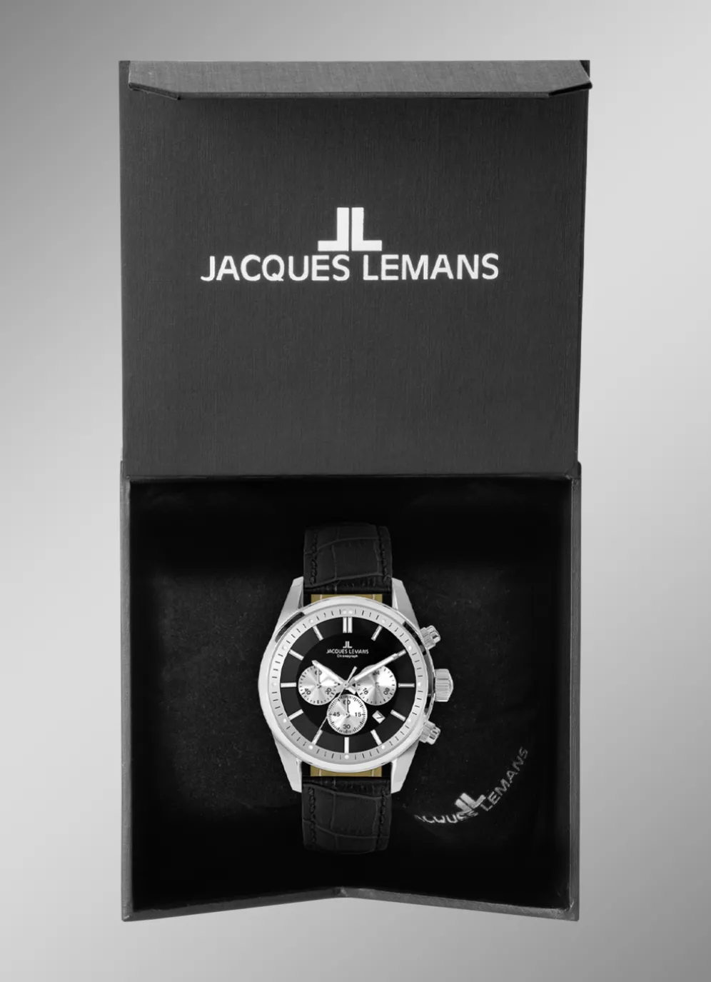 Das Modell 42-6.1A von Jacques Lemans ist ein klassisch, sportlicher Zeitmesser mit einem dezent, eleganten Touch. Das Gehäuse aus massiv Edelstahl hat einen Durchmesser von 42mm. Es umrahmt ein schönes, graues Zifferblatt mit Sonnenschliff und hellen Chronoringen für 24-Stunden Anzeige, Minuten- und Sekundenzähler und zeigt auch ein kleines Datum zwischen vier und fünf Uhr. Dieses Modell hat ein Quarzwerk, gehärtetes Crystex-Glas, einen runden, verschraubten Gehäuseboden und eine Wasserdichtigkeit von bis zu 10 bar. Das hochwertige, schwarze Lederband mit Dornschließe rundet den edlen Look perfekt ab – dieser Chronograph ist ein markanter Zeitmesser, der seine Wirkung immer behalten wird.