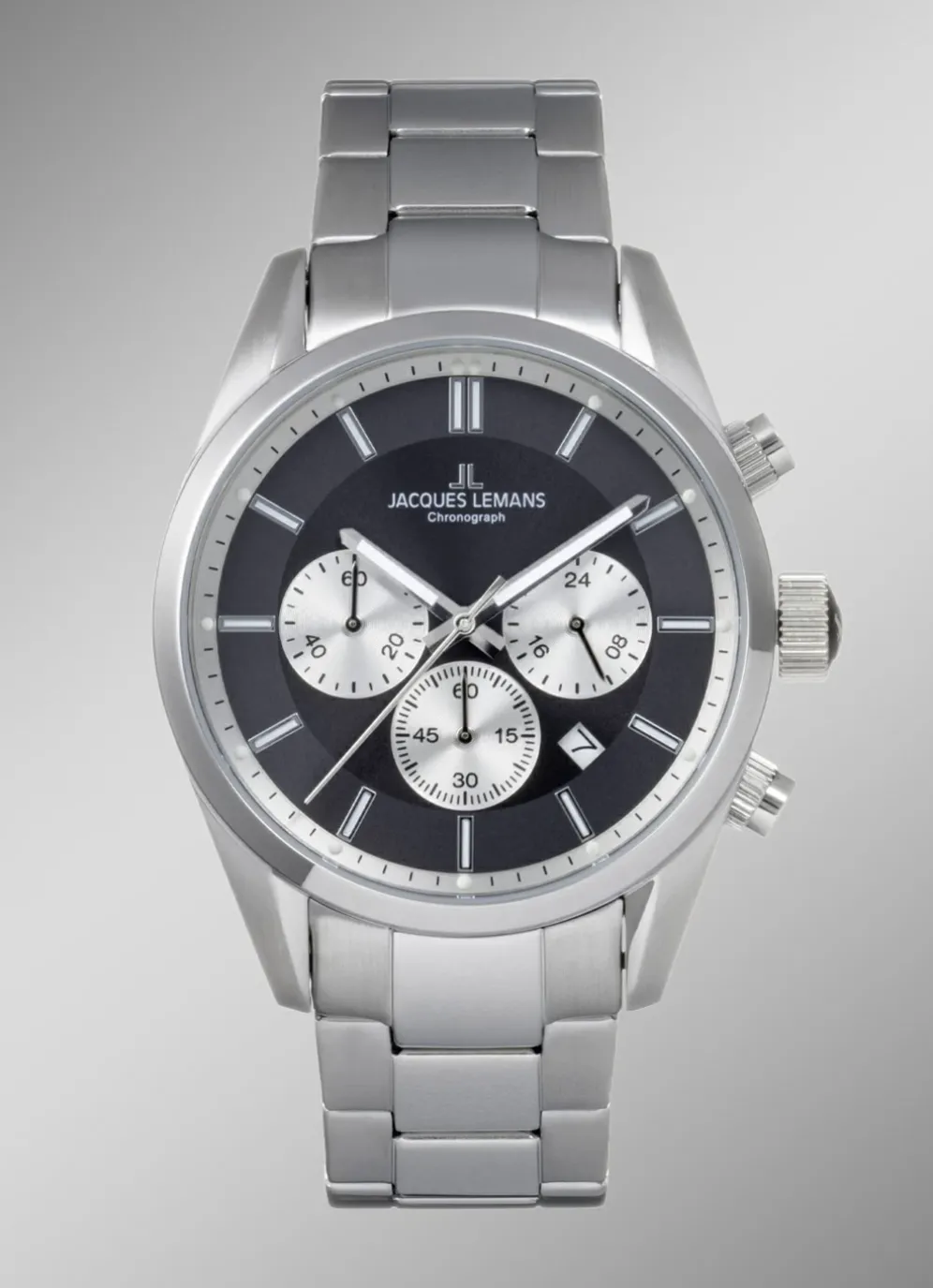 Das Modell 42-6.1E von Jacques Lemans ist ein klassisch, sportlicher Zeitmesser mit einem dezent, eleganten Touch. Das Gehäuse aus massiv Edelstahl hat einen Durchmesser von 42mm. Es umrahmt ein schönes, graues Zifferblatt mit Sonnenschliff und hellen Chronoringen für 24-Stunden Anzeige, Minuten- und Sekundenzähler und zeigt auch ein kleines Datum zwischen vier und fünf Uhr.
