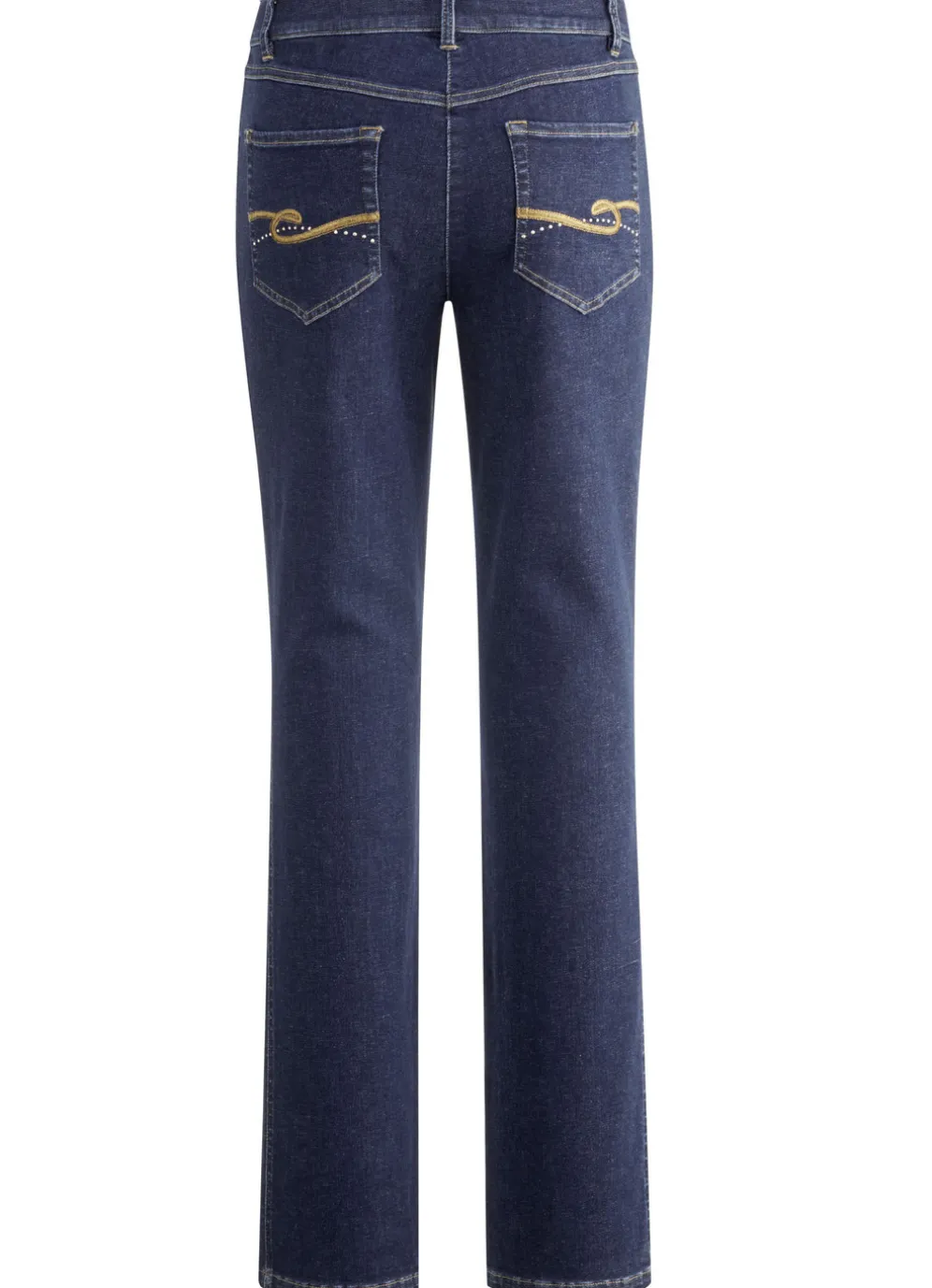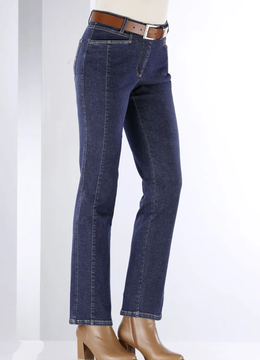 Tragangenehme Jeans in 4-Pocket-Form: elastischer Formbund, Gürtelschlaufen, Knopf- und Reißverschluss, Jeanssattel, figurgünstige Teilungsnähte im Vorderteil sowie kontrastfarbene Stickerei, verziert mit Steinchen an den aufgesetzten Gesäßtaschen. Innenbeinlänge ca. 78 cm, Fußweite ab 38 cm.