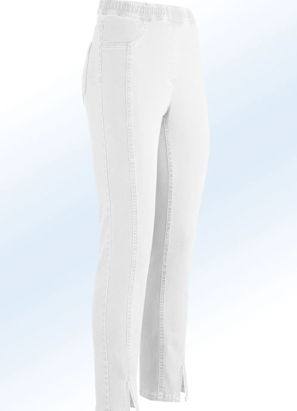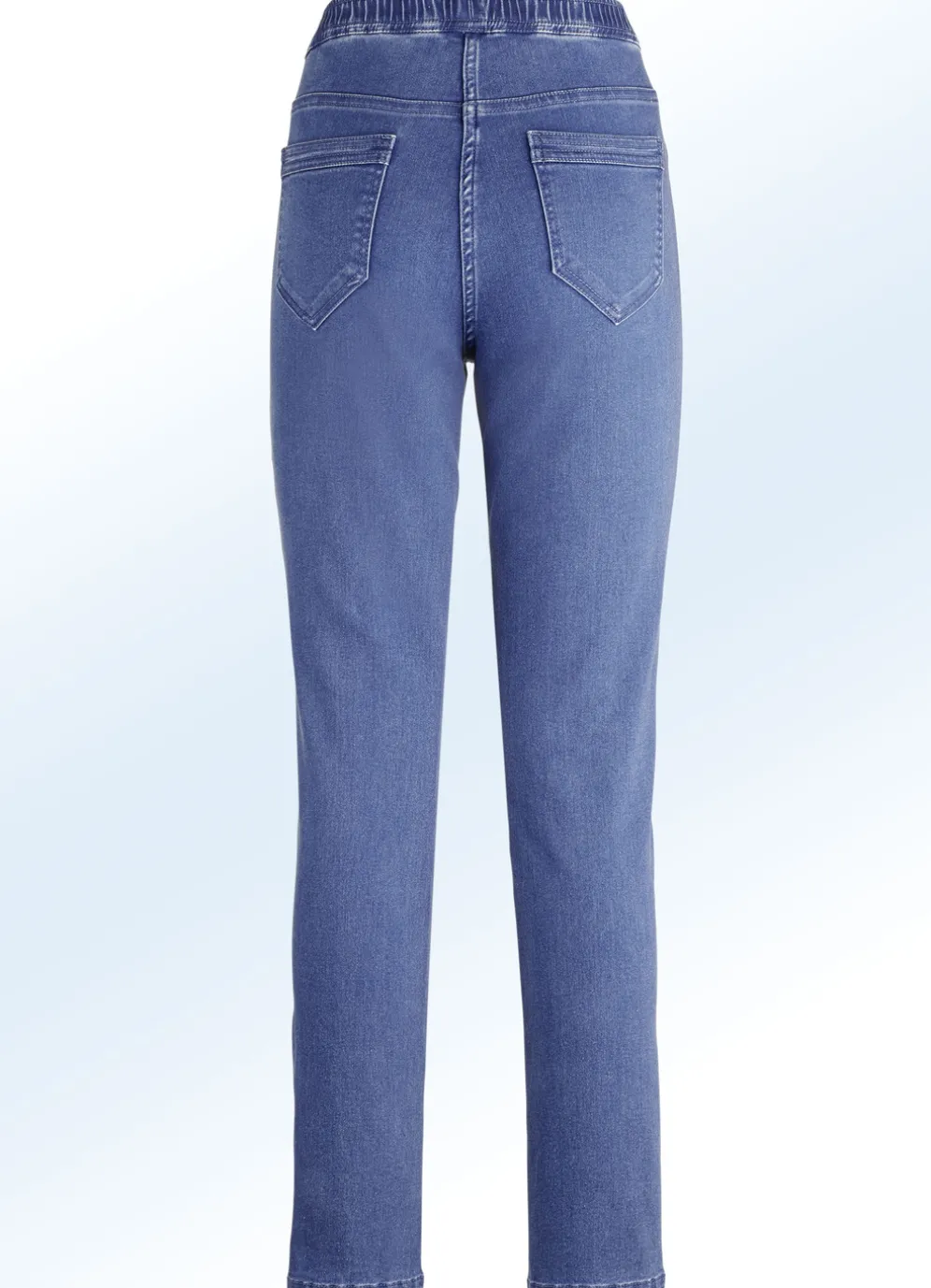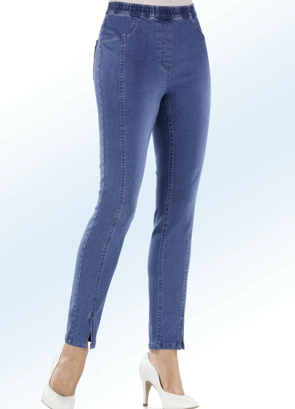 Superbequeme, knöchellange Jeans in Schlupfform mit Dehnbund rundum, angedeutete Reißverschluss-Zierblende, Ziersteppungen in Seitentaschen-Optik, Jeanssattel, aufgesetzte Gesäßtaschen, abgesteppte Teilungsnähte sowie vorderen Beinschlitze. Innenbeinlänge ca. 70 cm, Fußweite ab 27 cm.
