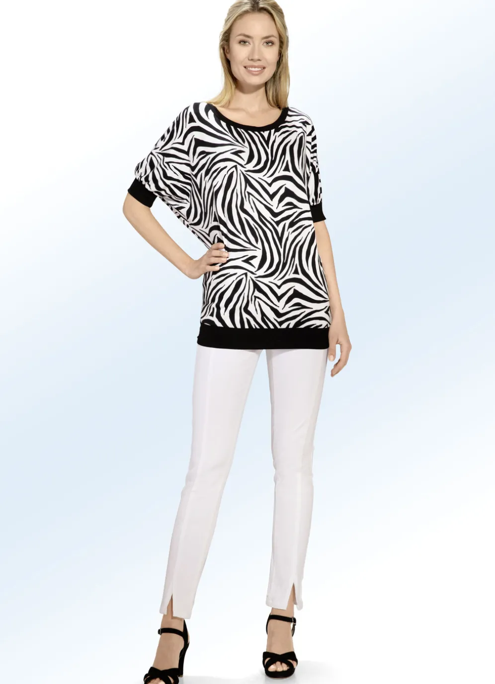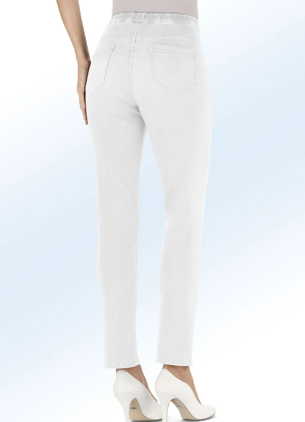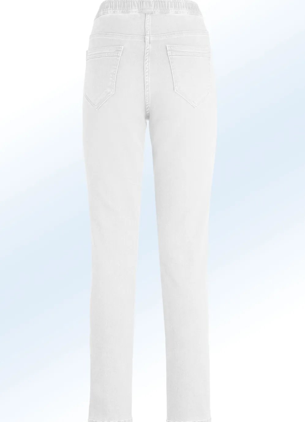 Superbequeme, knöchellange Jeans in Schlupfform mit Dehnbund rundum, angedeutete Reißverschluss-Zierblende, Ziersteppungen in Seitentaschen-Optik, Jeanssattel, aufgesetzte Gesäßtaschen, abgesteppte Teilungsnähte sowie vorderen Beinschlitze. Innenbeinlänge ca. 70 cm, Fußweite ab 27 cm.
