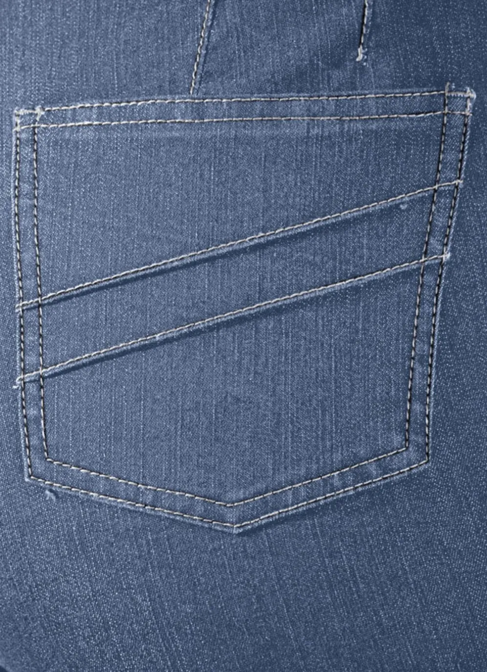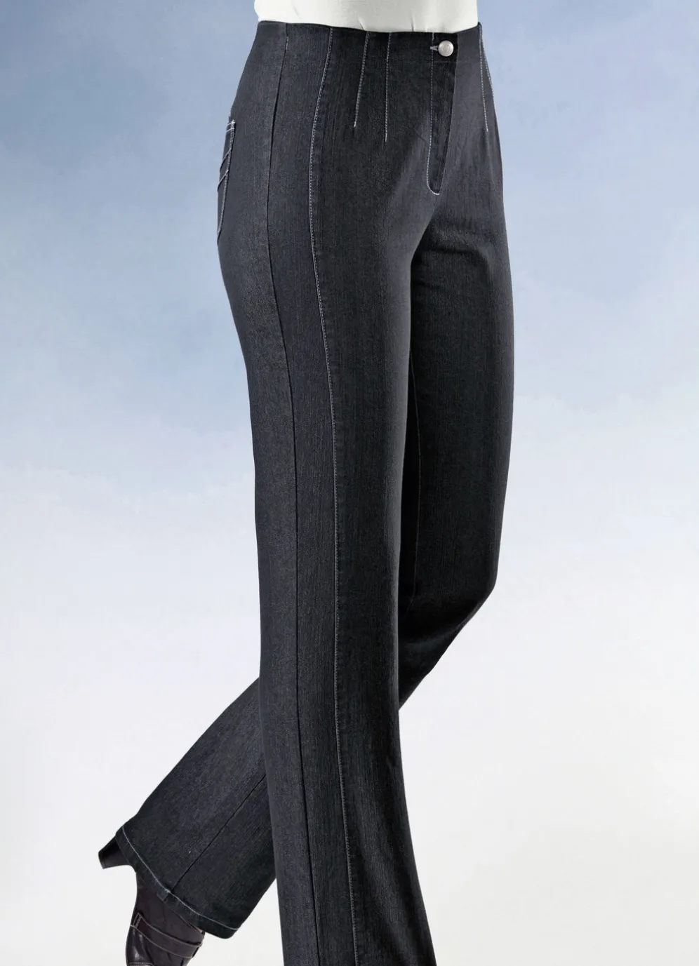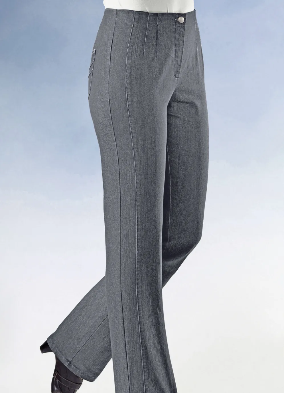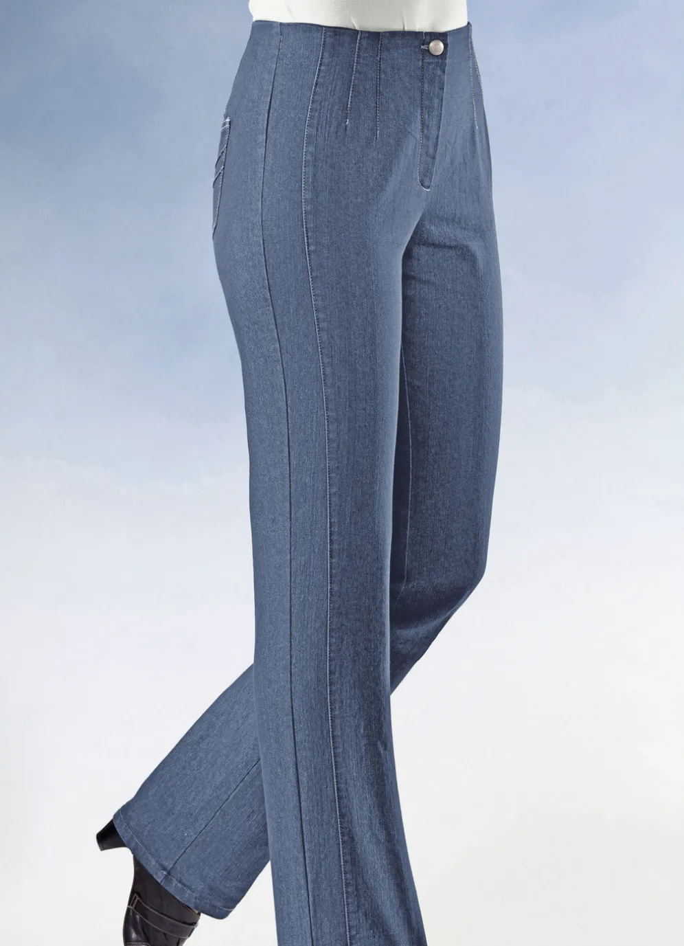Hochelastische, tragangenehme Jeans: angeschnittener Bund, Gummibundeinlage mit bis zu 6 cm Dehnreserve, Knopf- und Reißverschluss, figurformende Abnäher unterhalb des Bundes rundum, figurgünstige Teilungsnähte vorne. Innenbeinlänge ca. 80 cm, Fußweite ab 42 cm.