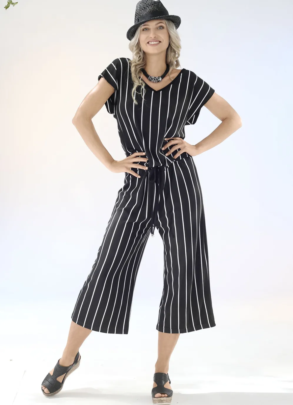 Ansprechender Jumpsuit mit Streifendessin in Schwarz-Ecru allover, überschnittener Schulterpartie, Tunnelzug mit abnehmbarem Bindeband in der Taille sowie weite Beinform im trendigen Look.