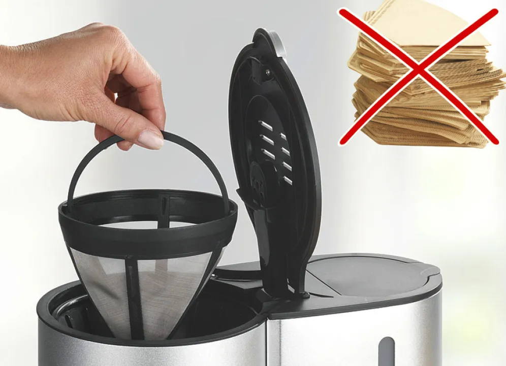 Kaffee-Dauerfilter – schont die Umwelt und den Geldbeutel. Kein unnötiger Müll mehr. Die mikrofeine Porenstruktur des hochwertigen Edelstahlfilters sorgt für höchsten Kaffeegenuss. Aromatreu und geschmacksneutral. Universell passend für alle gängigen Kaffeemaschinen oder als Hand-Kaffeefilter. Ideal auch im Büro oder auf Reisen. Mit Henkel. Spülmaschinengeeignet. Filtergröße 1×4 für bis zu 12 Tassen.