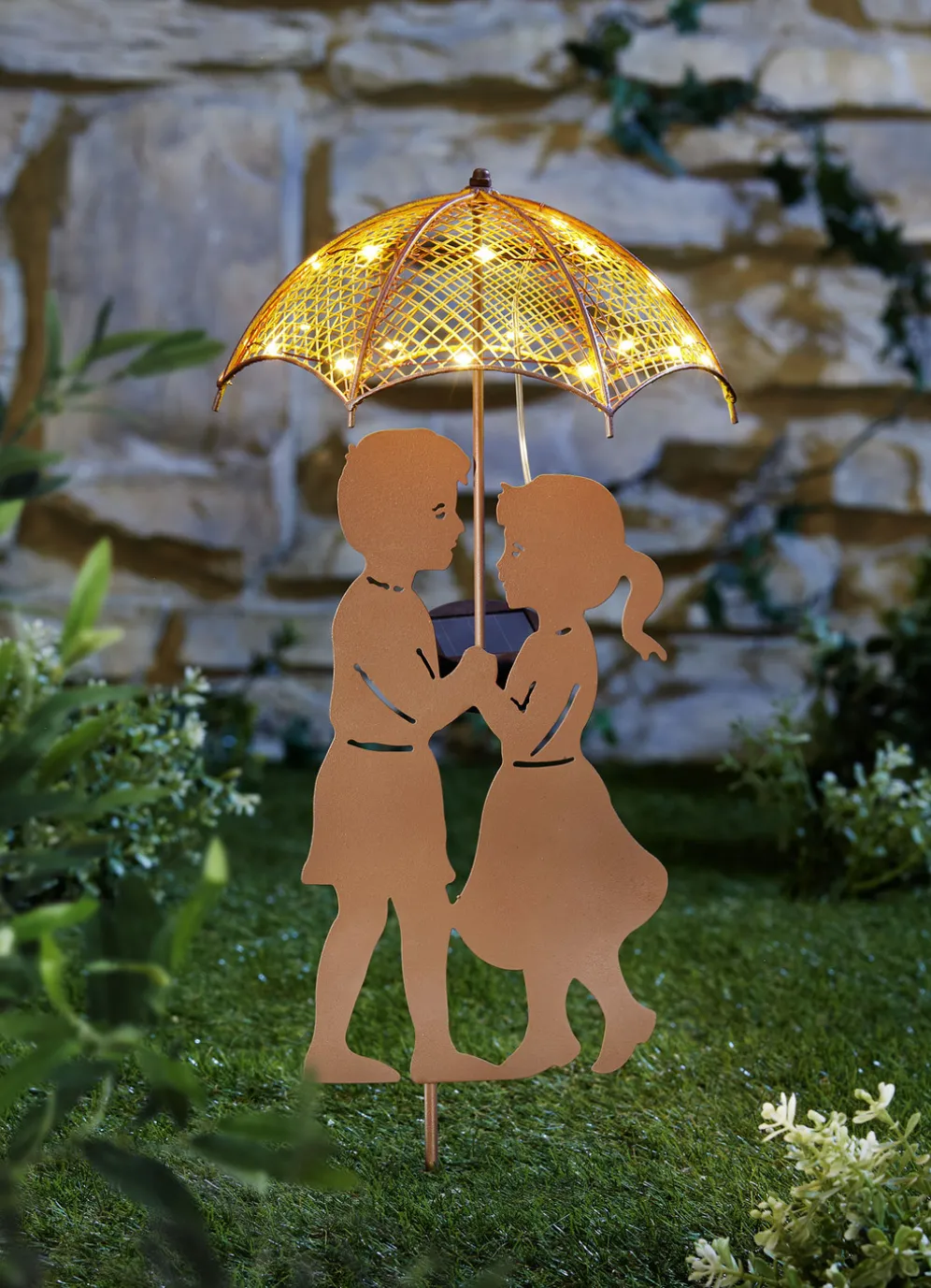 Dieser Solarstecker bringt zauberhafte Stimmung in Ihren Außenbereich! Das charmante Dekoobjekt zeigt ein liebevolles Paar unter einem Regenschirm, der im Dunkeln dank Solartechnik von 22 warmweißen LEDs beleuchtet wird. Aus rostfarben beschichtetem Eisen. Maße: H35 cm + Erdspieß, ø Schirm 20 cm.