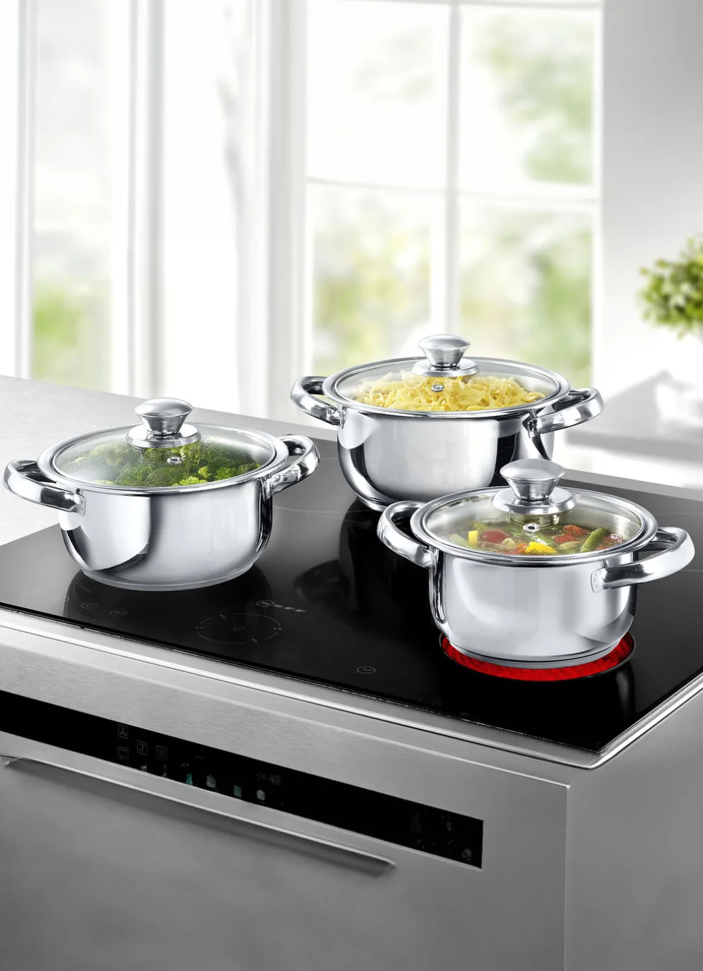 Topf-Set besteht aus: 3 Kochtöpfen (ø 16 cm/1 l; ø 18 cm/1,4 l; ø 20 cm/1,8 l) je mit Glasdeckel. Spülmaschinengeeignet. Mit Kapselboden. Für alle Herdarten geeignet, auch Induktion.