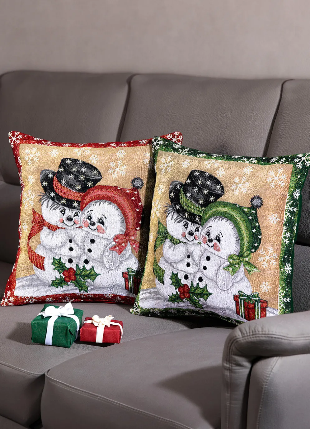 Mit Schal, Zylinder und Mütze perfekt ausstaffiert, erfreuen sich Schneemann und Schneefrau auf diesem 2er-Set Kissenbezügen an den tanzenden Schneeflocken um sie herum. Mit praktischem Reißverschluss. Die Qualität: Gobelin aus 65% Baumwolle, 35% Polyester. Maße: 40×40 cm.