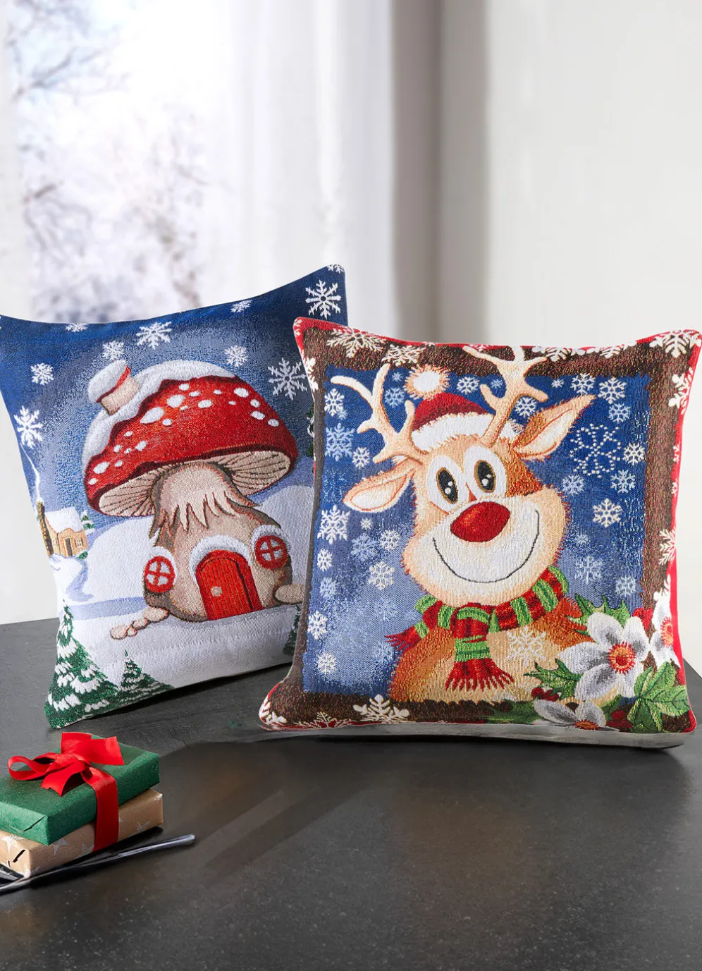 Verbreiten Sie Freude mit dieser lustigen Kissenbezügen! Das süße Rentier ist mit Mütze und Schal bestens gerüstet für die kalte Jahreszeit und auch der Fliegenpilz ist während des Schneefalls bewohnt! Auf einer Seite aus hochwertigem Gobelin gefertigt. Die exzellente Qualität: 65% Baumwolle und 35% Polyester. Maße: 40×40 cm