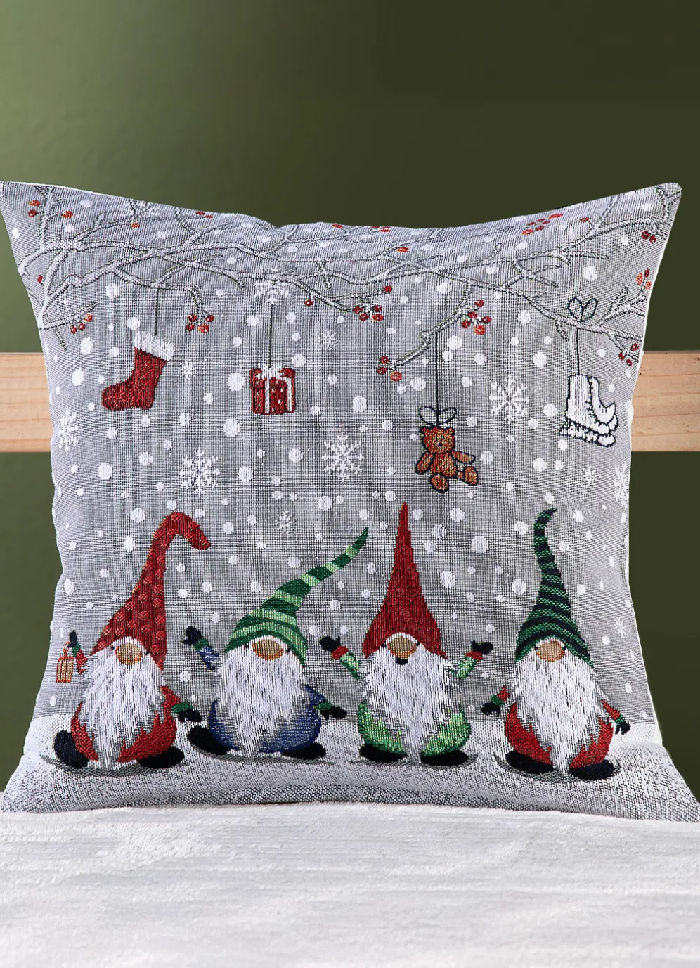 Dieser liebevoll gestaltete Kissenbezug in hochwertiger Gobelin-Qualität bringt mit seiner fröhlichen Wichtelbande eine festliche Stimmung und ein Augenzwinkern in Ihre Wohnräume. Mit praktischem Reißverschluss sowie Uni-Rückseite. Die Qualität: Gobelin aus 65% Polyester und 35% Baumwolle. Handwäsche. Maße: 40×40 cm.