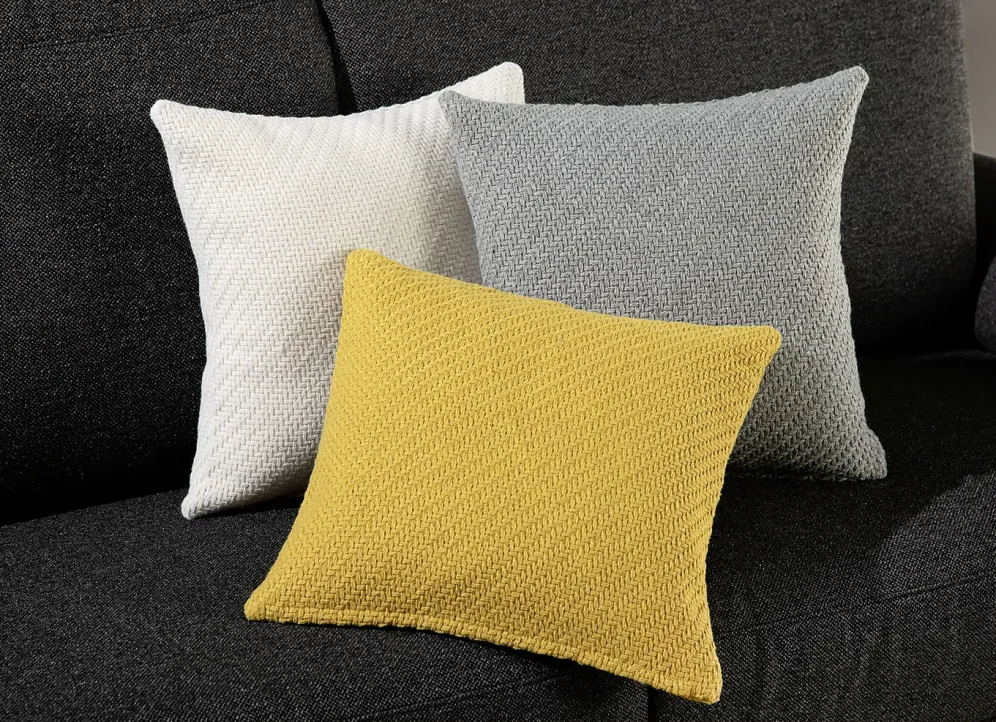 Kissenbezüge mit strukturierter Oberfläche in Strickoptik. Mit Reißverschluss. Qualität: 95% Polyester und 5% Wolle. Maße 40×40 cm.