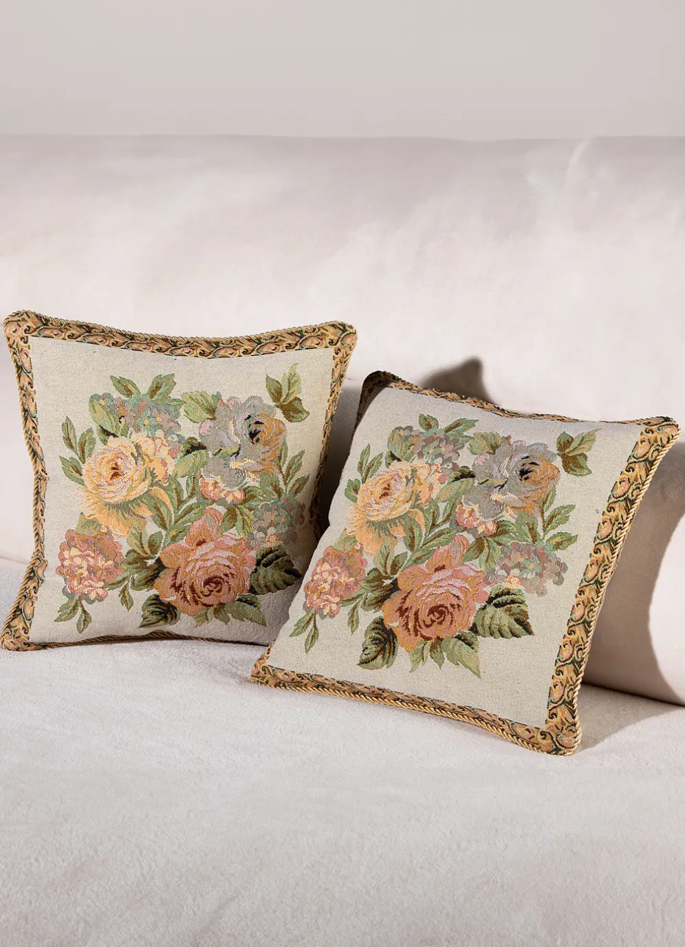 Diese bildschönen Kissenbezüge mit romantischem Rosen-Motiv wirken durch ihre zarten Farben besonders dekorativ. Mit Reißverschluss. Gobelin aus 65% Polyester und 35% Baumwolle. Maße: 40×40 cm.