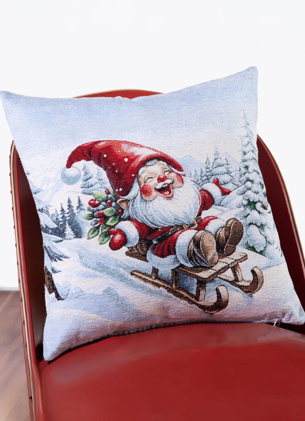 Der lustige Weihnachtsmann auf diesem Kissenbezug fährt in einer verschneiten Winterlandschaft auf seinem Schlitten lachend einen Berg hinunter. Mit praktischem Reißverschluss. Die Qualität: Jacquard, 51% Polyester, 45 % Baumwolle und 4% metallisiertes Garn. Waschbar bis zu 30 °C. Maße: 45×45 cm.