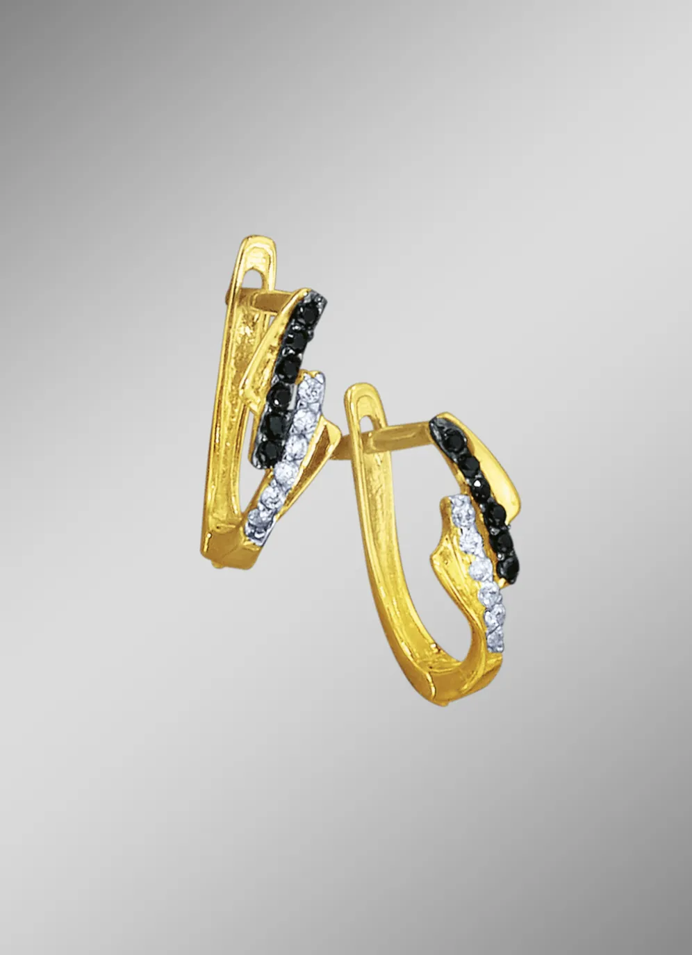 Klappcreolen in Gold 585/- fein oder Gold 333/- fein, mit synth. Zirkonia in Schwarz und Weiß.