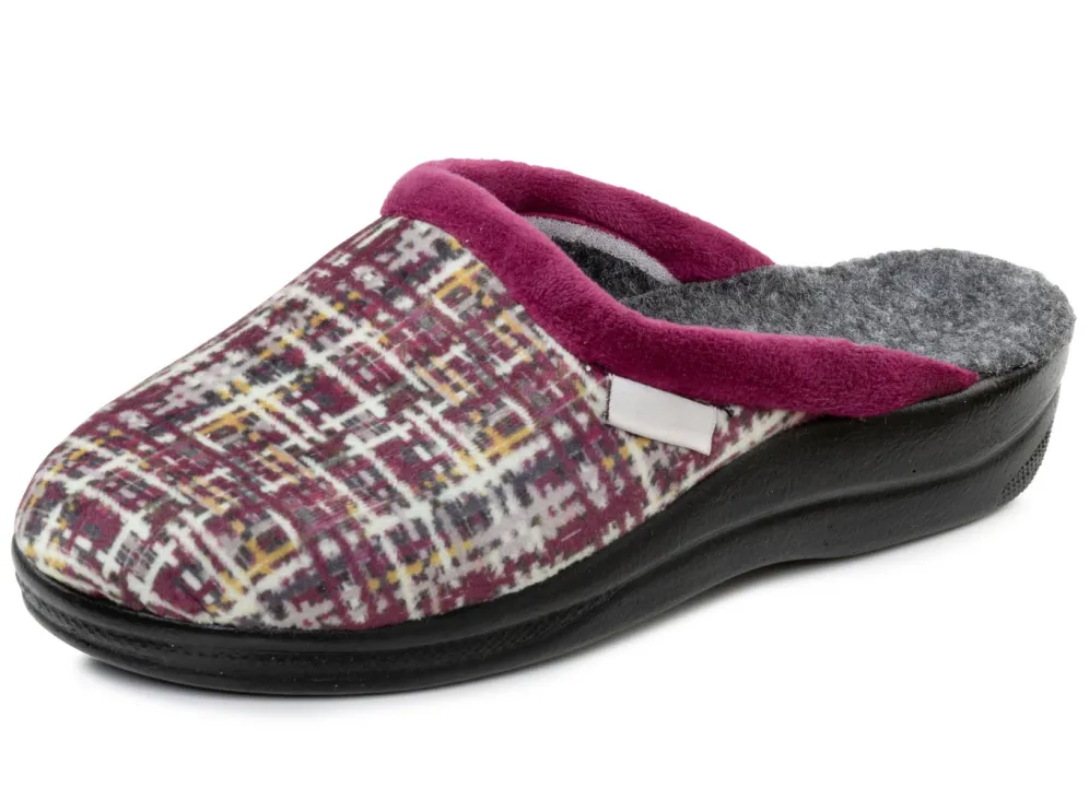 Hausschuhe aus weichem, kariertem Samt, mit angenehmer Polsterung: Weite G, Futter und Fußbett aus Filz, superleichte PU-Laufsohle sowie 20 mm Keilabsatz