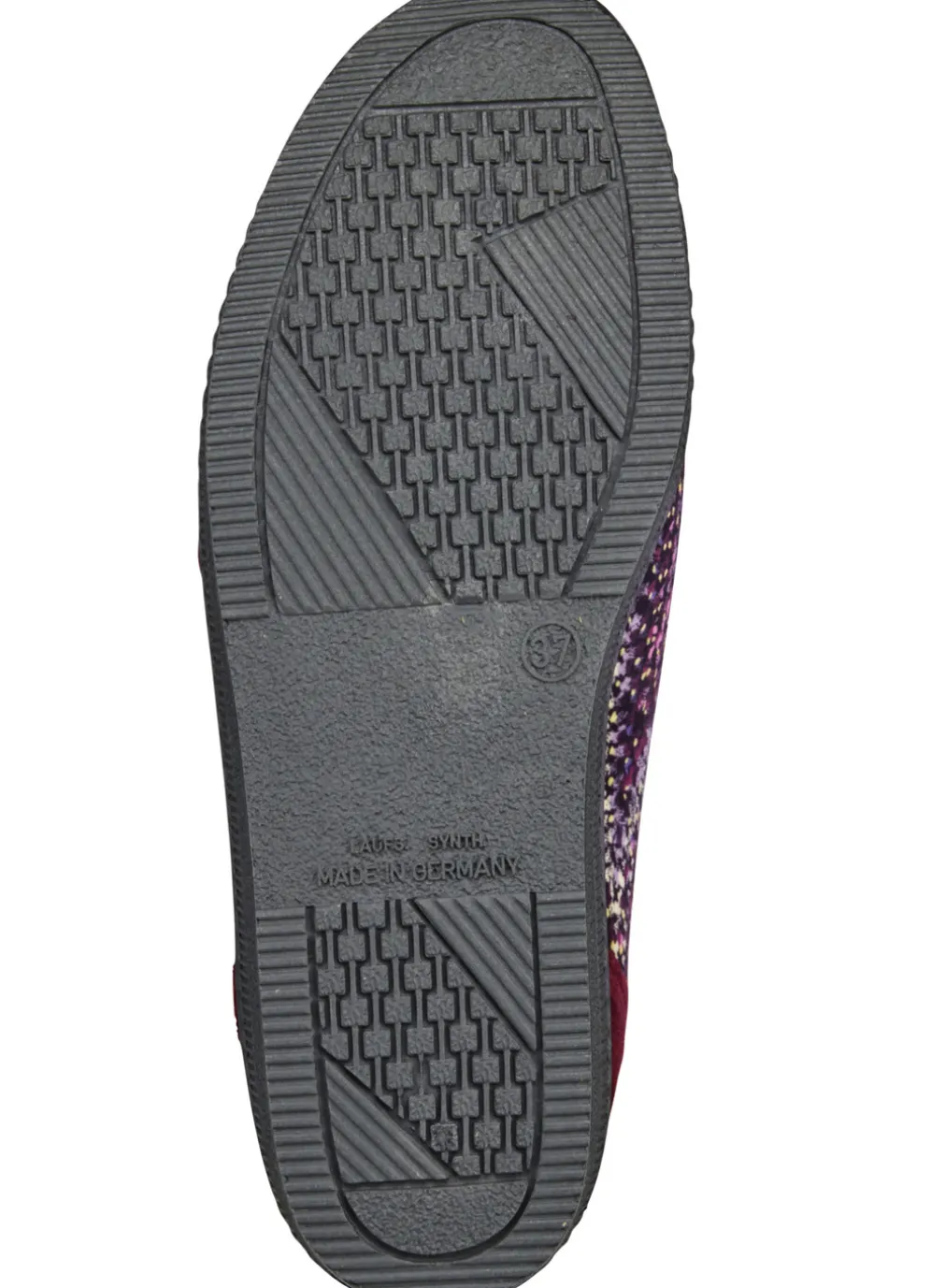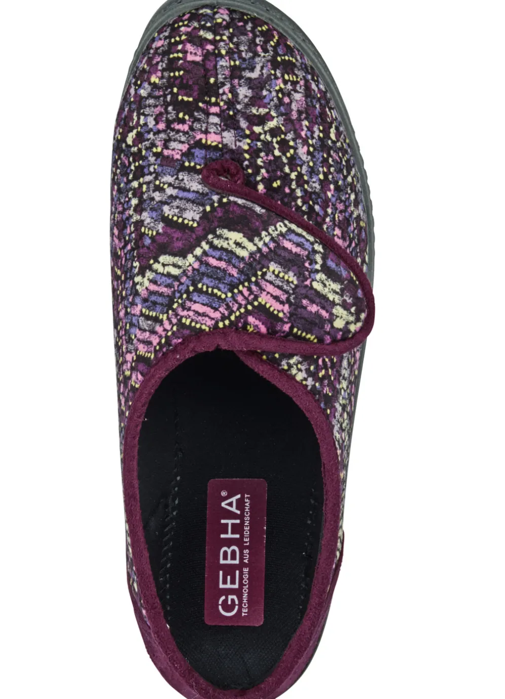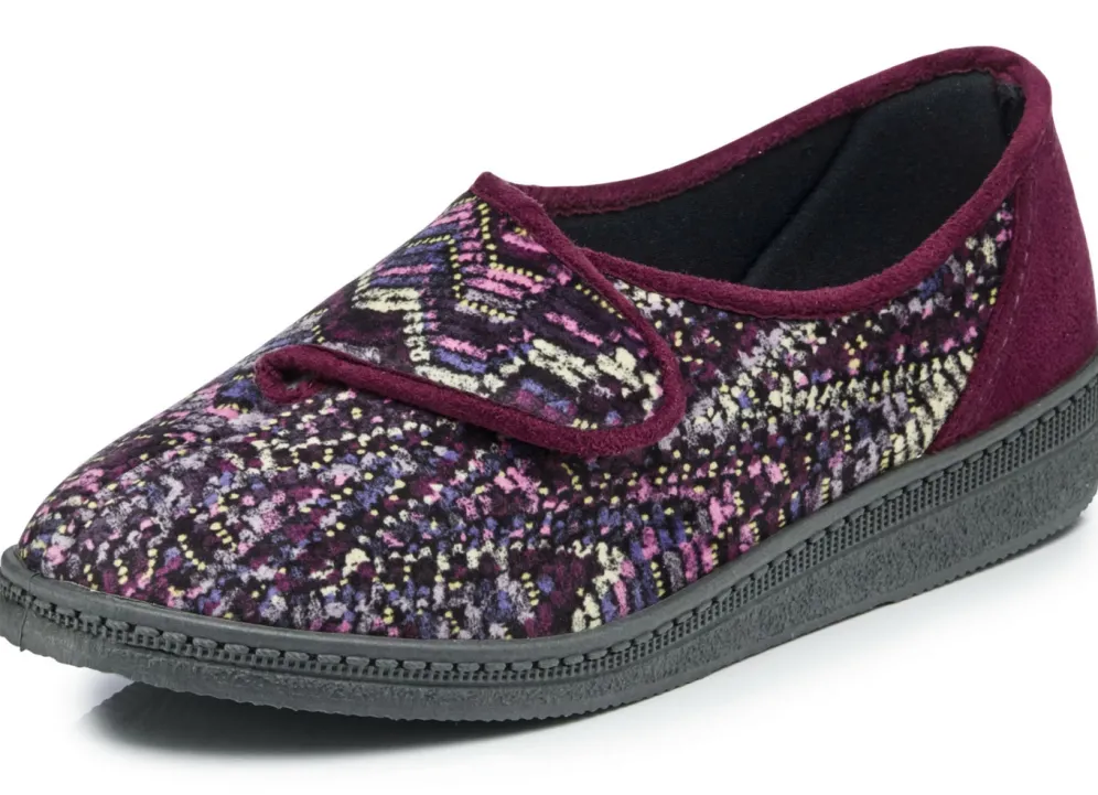 Klassische Damen-Hausschuhe, Weite H, mit Klettverschluss in Bordeaux-Multicolor und in Größe 40.