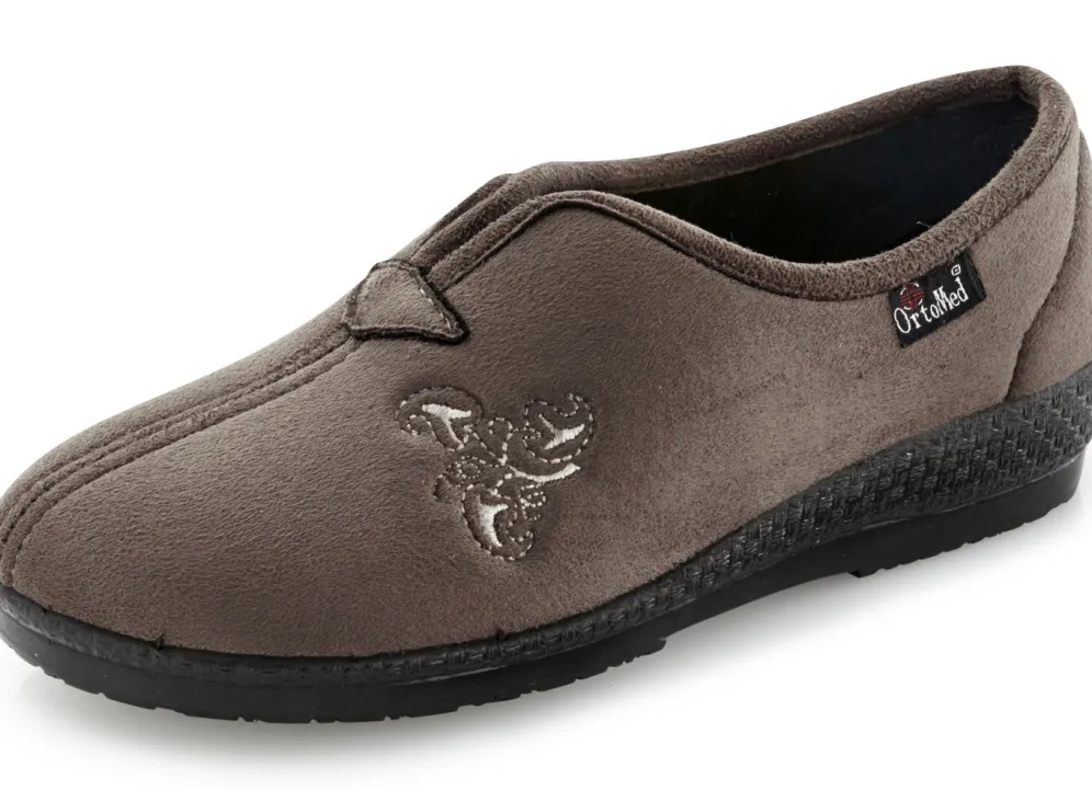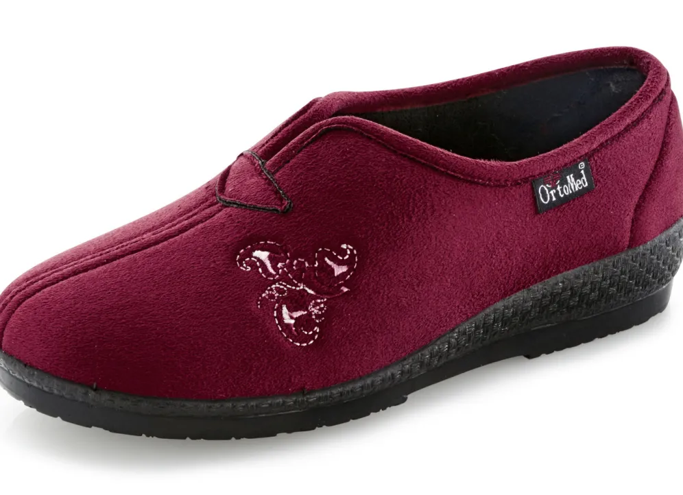 Hausschuhe aus weichem Veloursmaterial mit Stickereizier: Weite H, gepolstertes Futter und Fußbettbezug aus Textil, superleichte PU-Laufsohle sowie 25 mm Keilabsatz