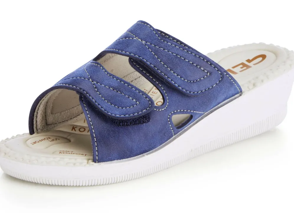 Pantoletten aus Veloursmaterial, mit Elastikeinsatz im Ballenbereich: Weite H, zwei verstellbare Klettspangen, Futter, gepolstertes Fußbett, leichte PU-Profilsohle sowie 30 mm Keilabsatz