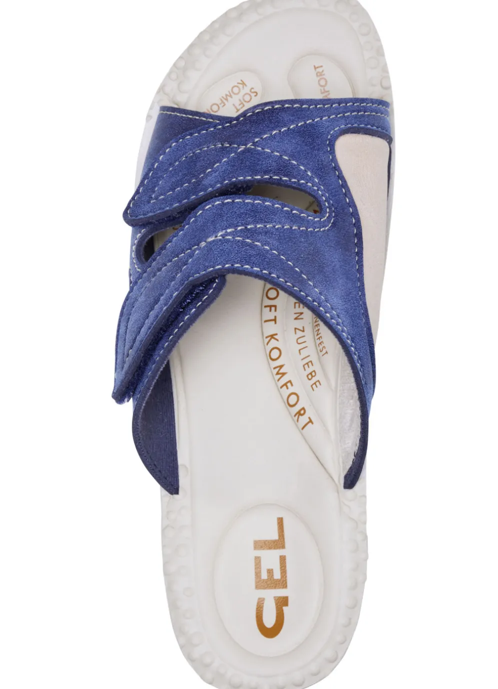 Klassische Damen-Pantoletten, Weite H, mit elastischem Material in Blau und in Größe 38.