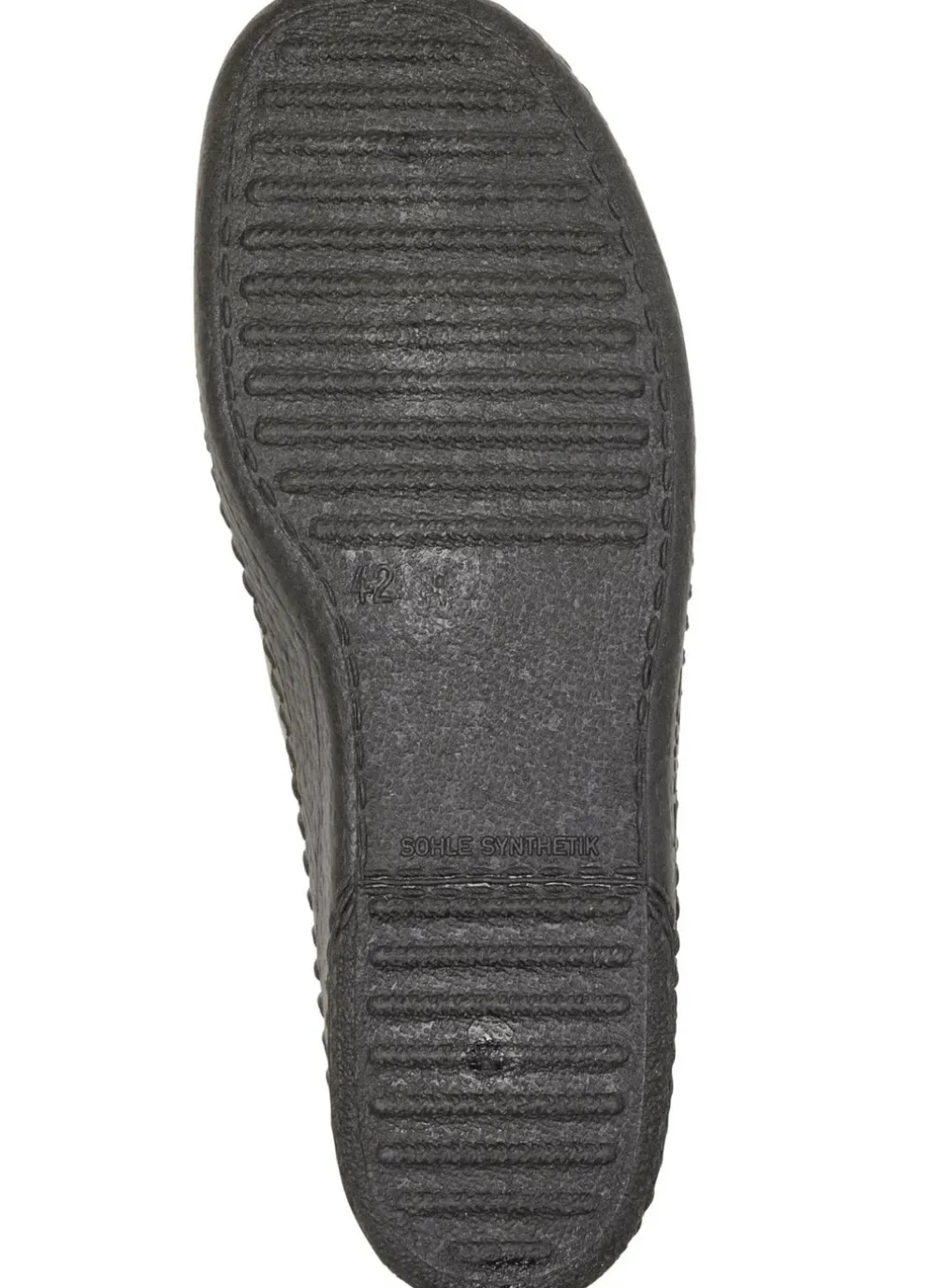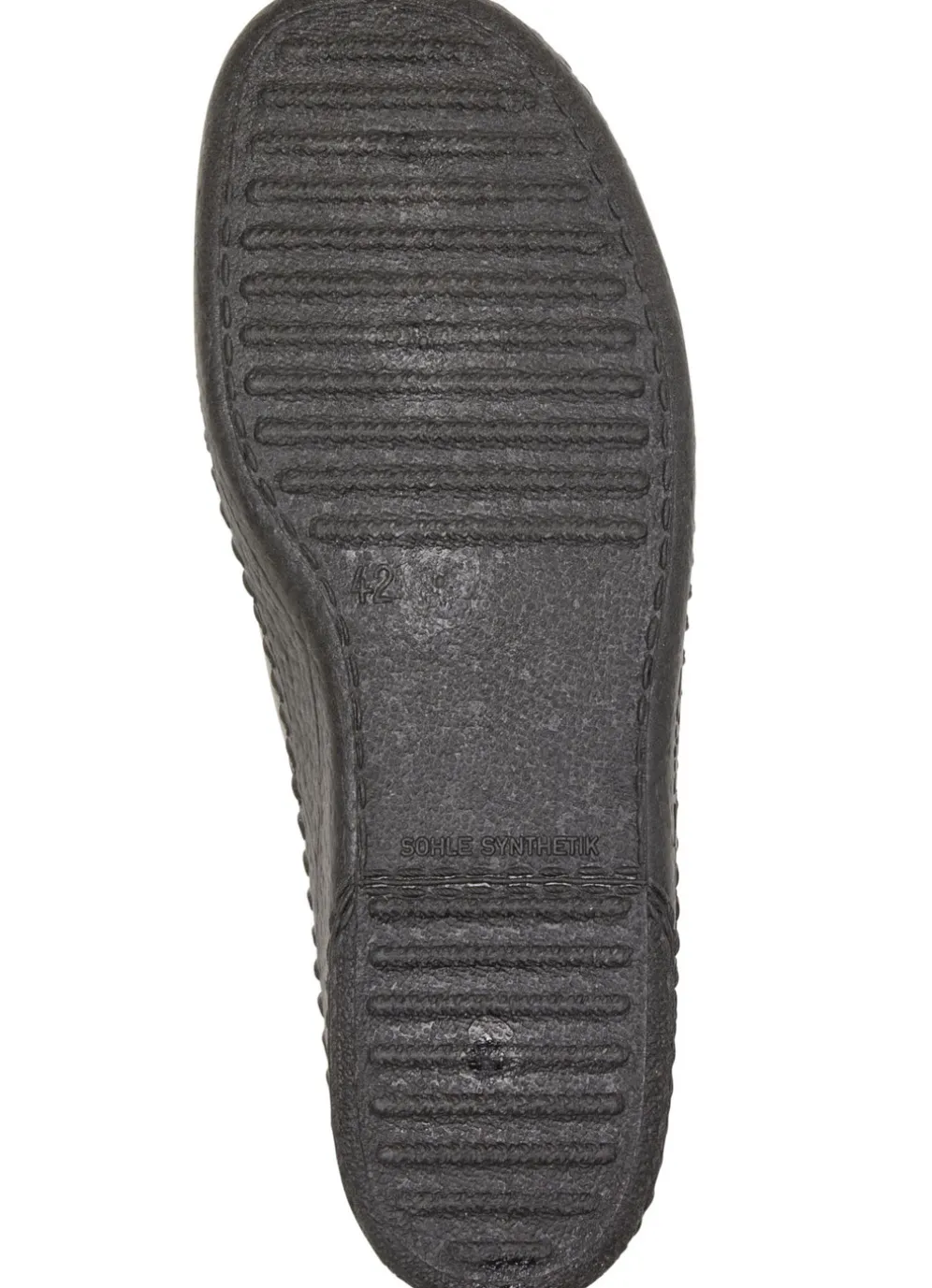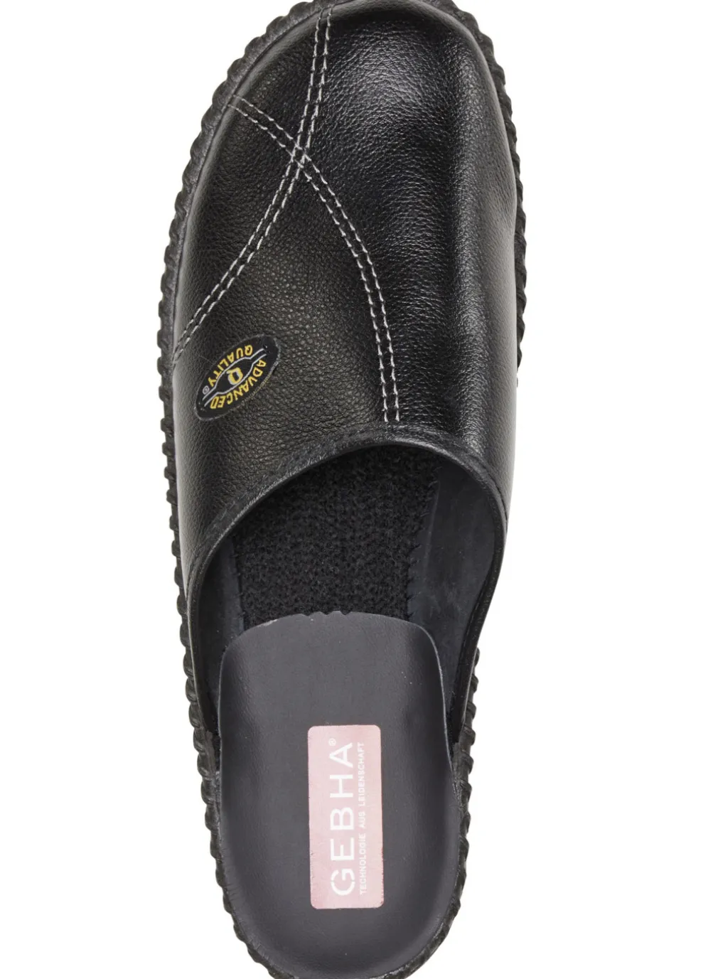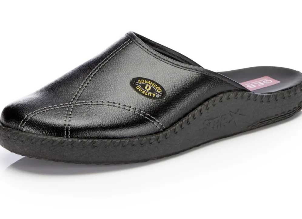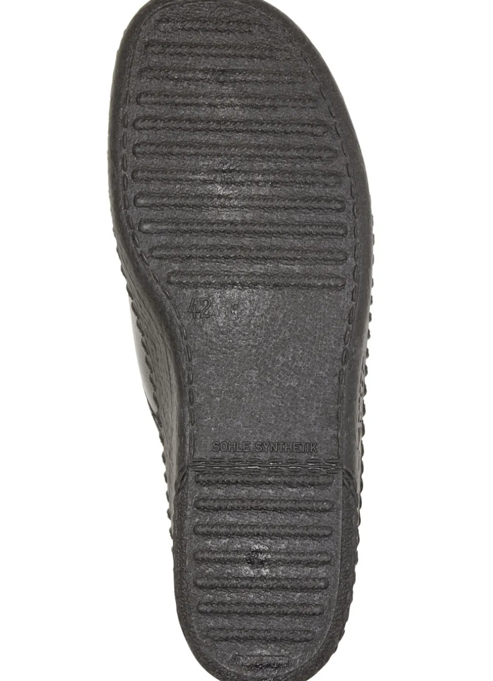 Pantoletten aus genarbtem, kaschiertem Nappaleder mit Zier-Nähten: anatomisch geformtes Fußbett mit Zehengreifer sowie leichte Synthetik-Laufsohle