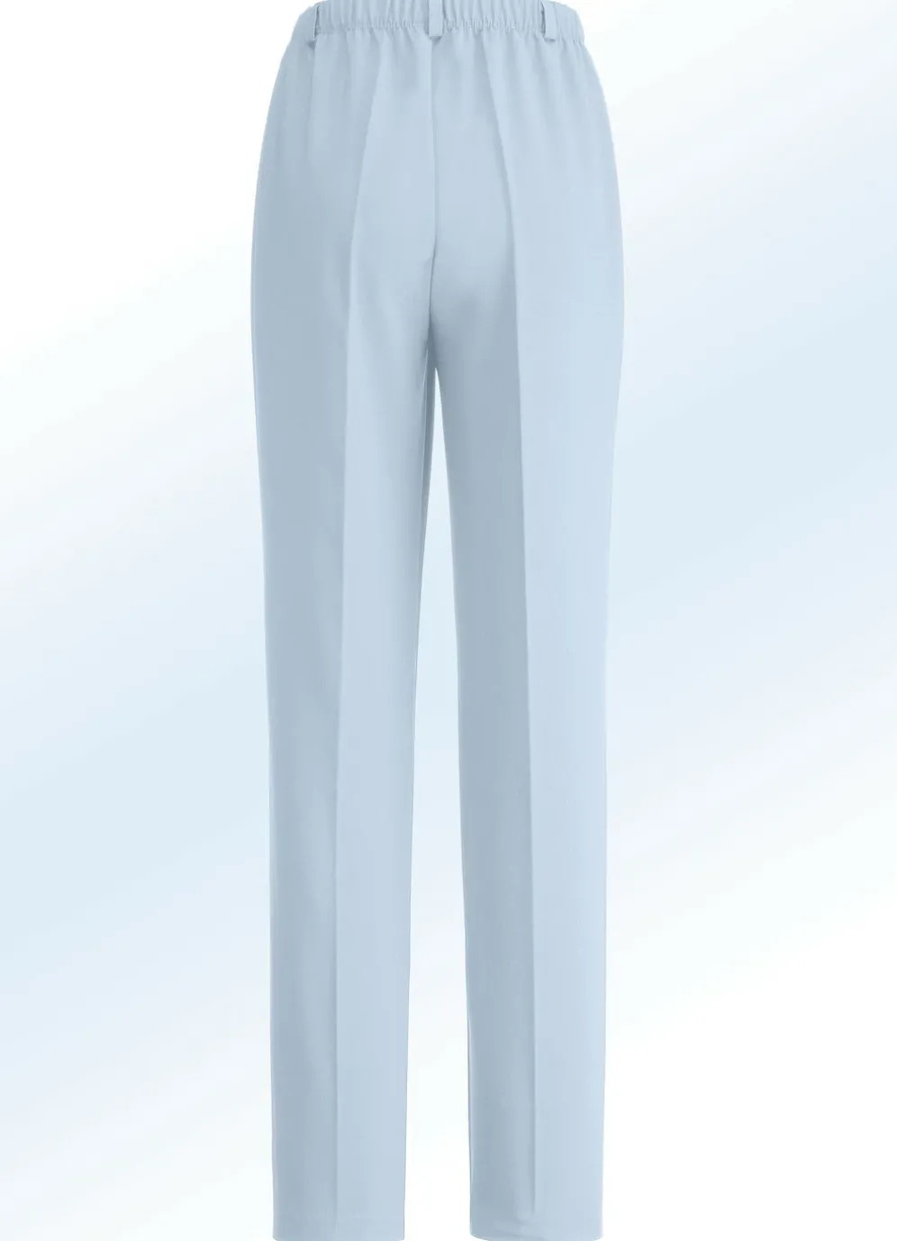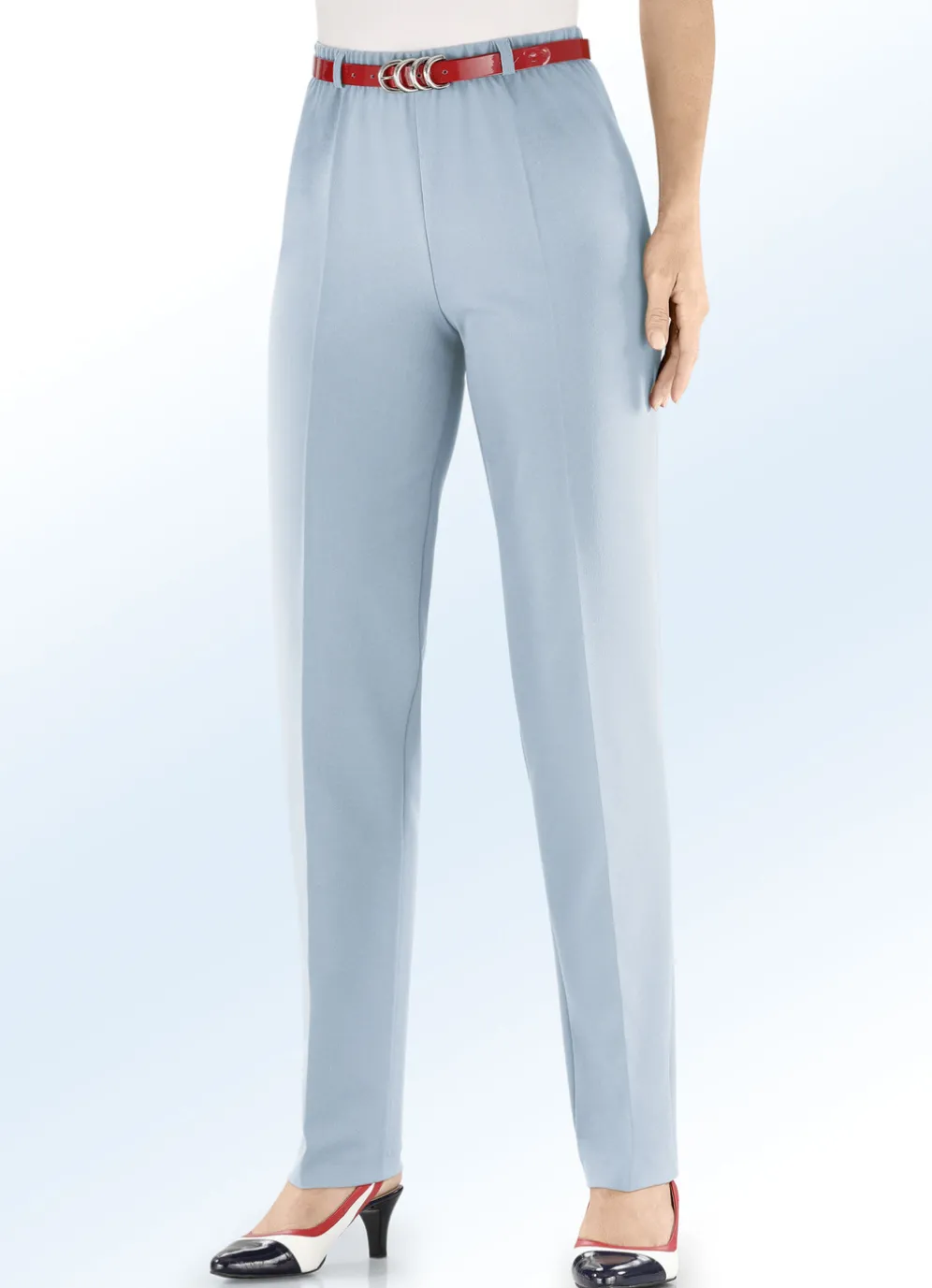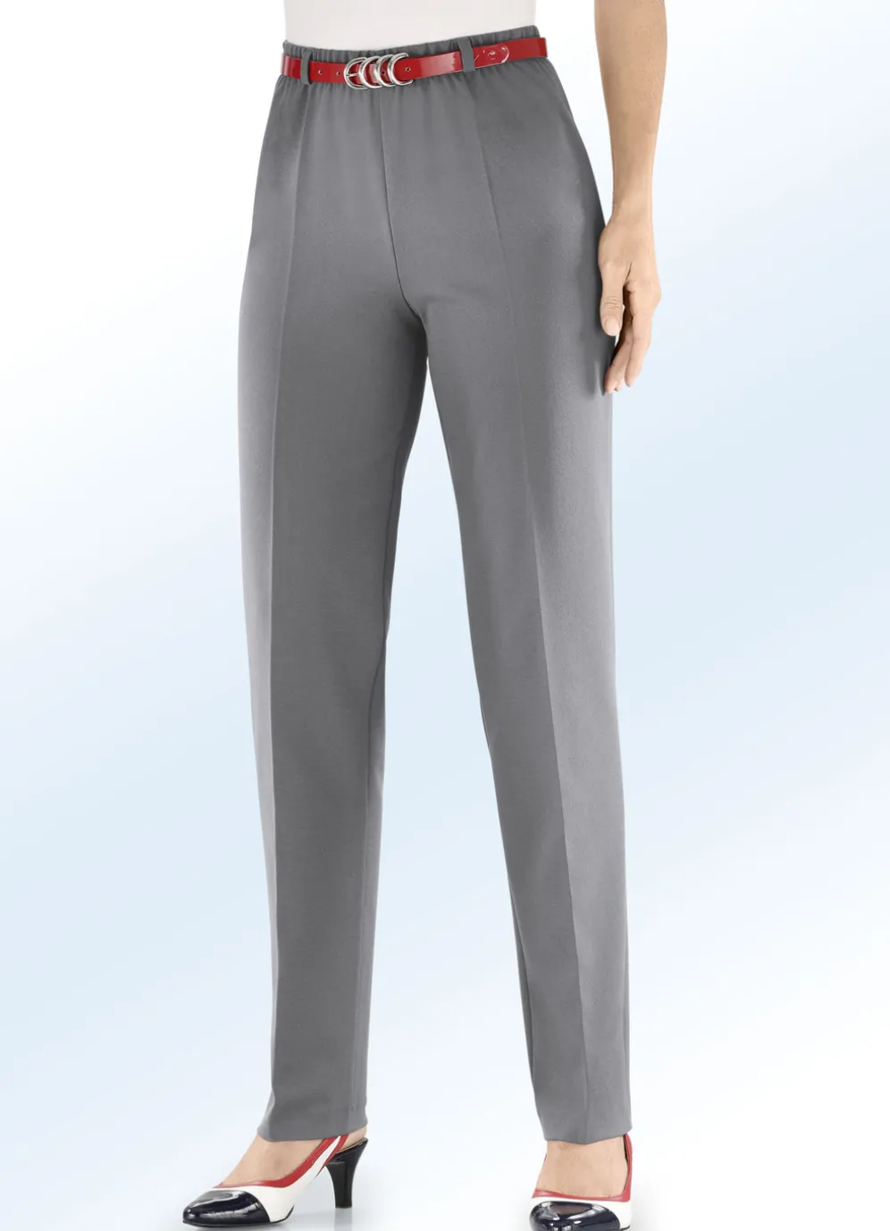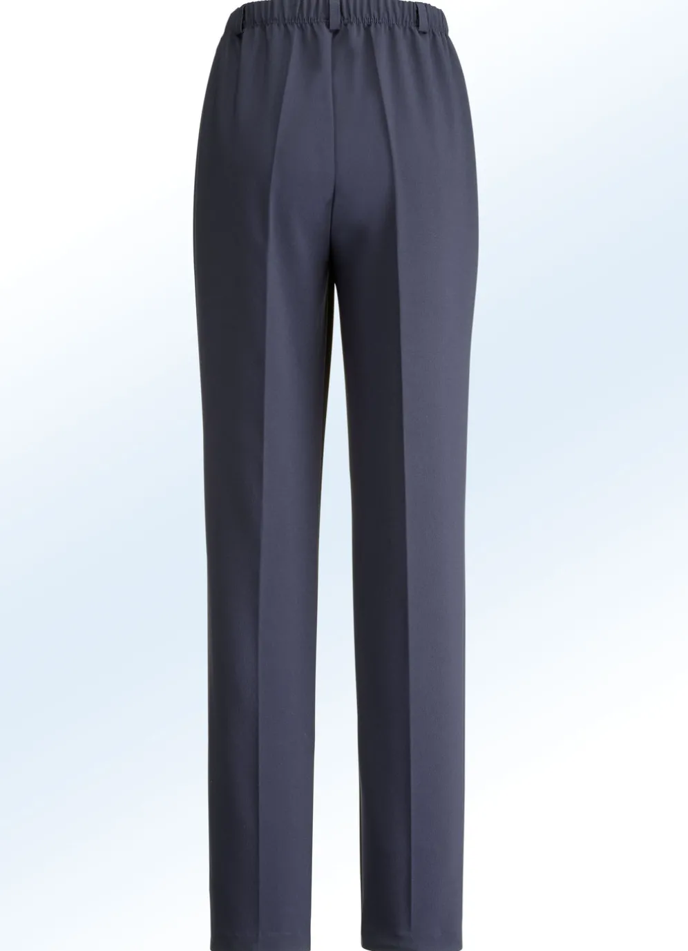 Klassische Hose in Schlupfform, mit Dehnbund rundum sowie Gürtelschlaufen. Ohne Gürtel. Innenbeinlänge ca. 78 cm, Fußweite ab 36 cm.