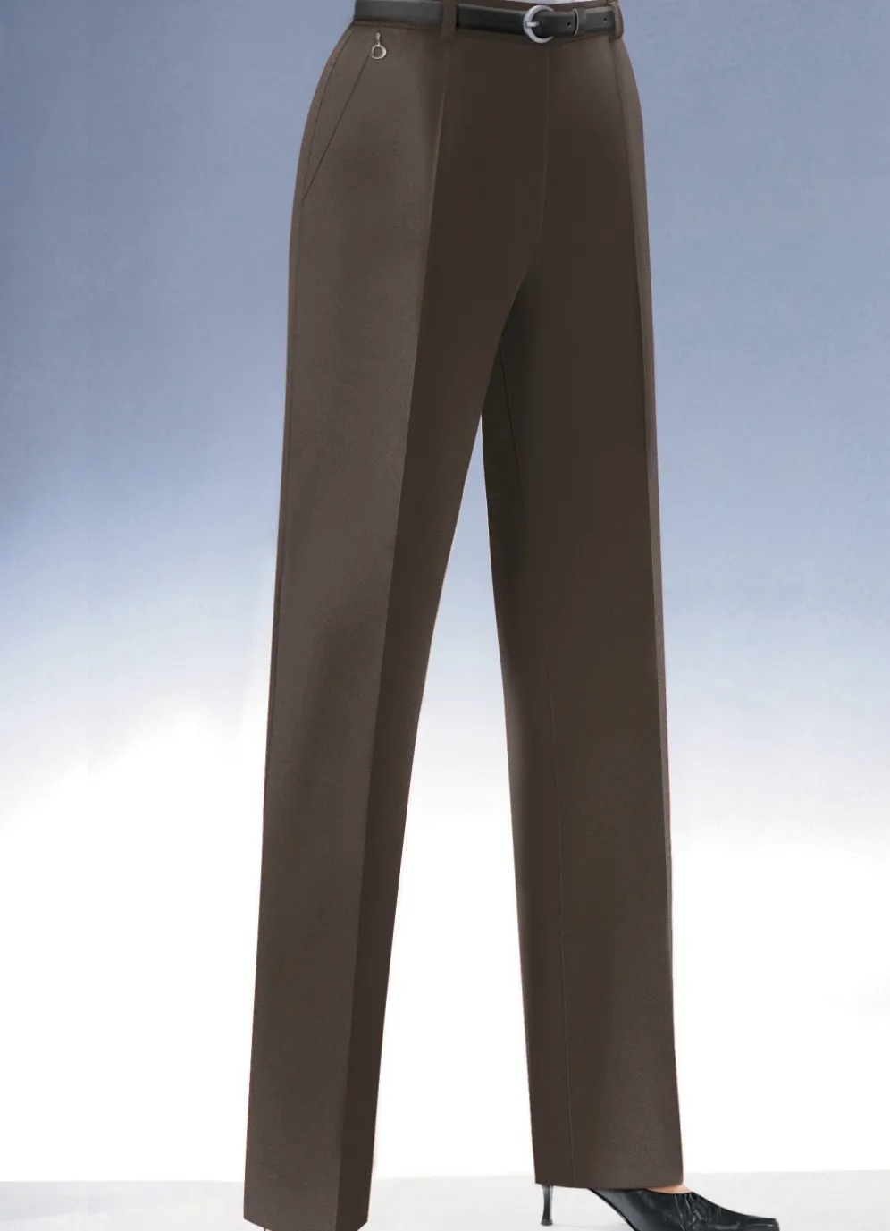 Schöne, klassische Hose mit Stretchbund, Gürtelschlaufen, Haken- und Reißverschluss sowie Seitentaschen mit Reißverschluss und Zieranhänger. Innenbeinlänge ca. 80cm, Fußweite ab 44 cm.