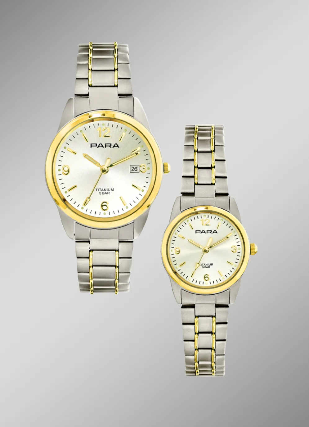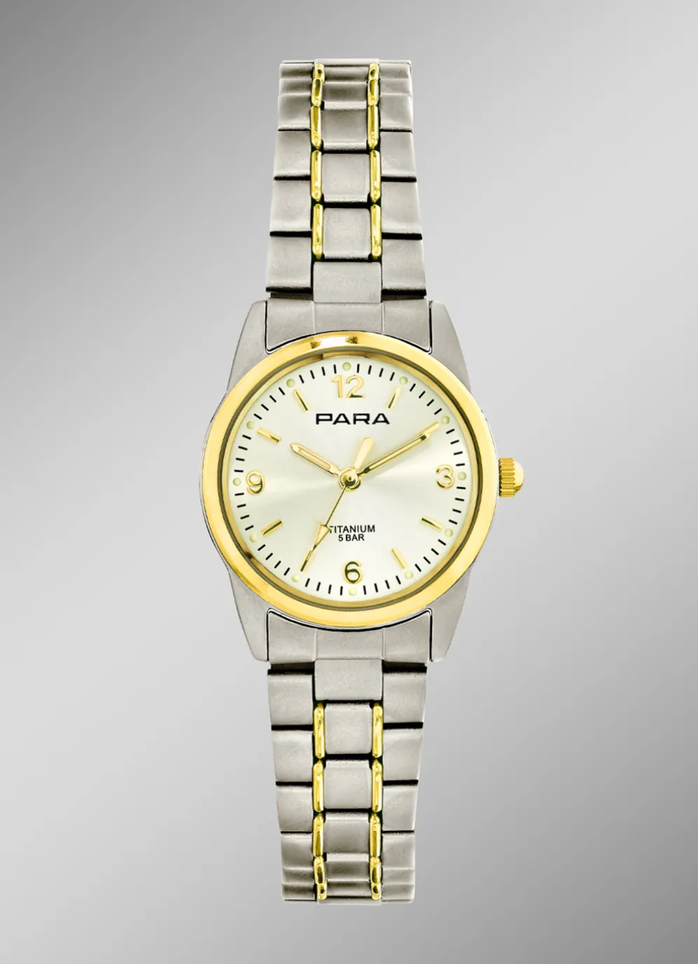 Klassische Partneruhren der Marke Para in der Ausführung Damenuhr, mit Gehäuse aus Titan sowie mit einem Uhrenband aus Titan.