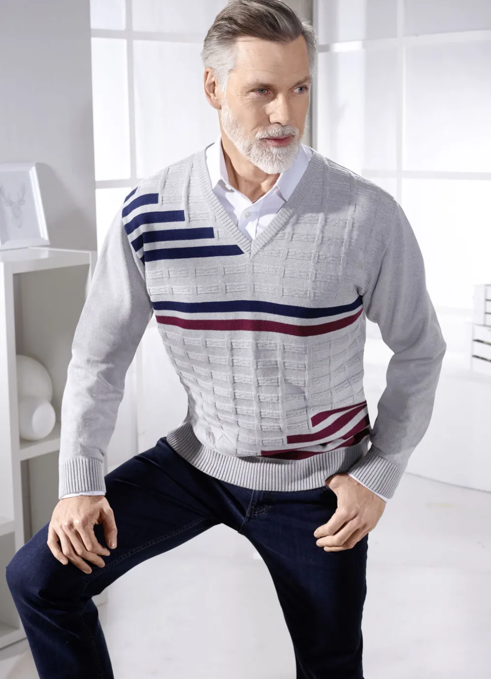 Mit markantem, kontrastfarbenem Struktur- und Streifendessin im Vorderteil: klassischer V-Pullover mit Rippenstrick-Abschlüssen an Ärmeln und Saum.